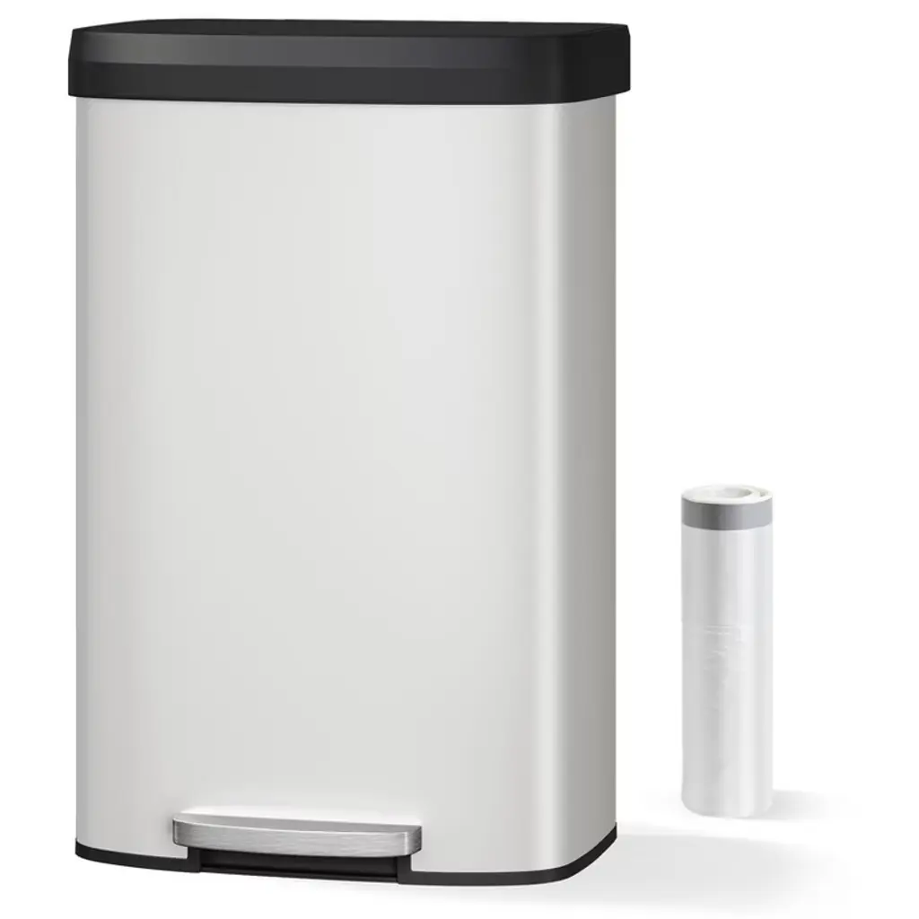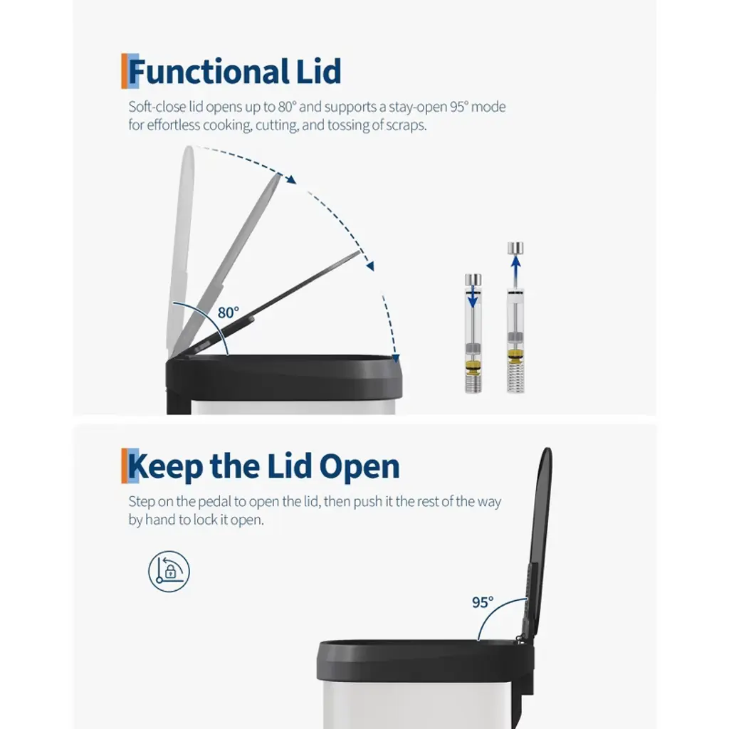 Tired of bulky, hard-to-clean trash cans? Our 21-gallon stainless steel recycling bin merges superior functionality with modern aesthetics, delivering an unparalleled organization experience. It's not just a bin; it's an intelligent upgrade for your lifestyle.SpecificationsSlow-Close LidStainless Steel BodyBlack LidAnti-Slip PP BaseBuilt-in Odor FilterLid Fixing FunctionBag Hiding Pressure RingIndustrial Steel PedalProduct Details:Say goodbye to noise pollution! The built-in slow-close mechanism ensures the lid descends gently and quietly, preserving peace in your home or office.Crafted from durable stainless steel (0.45mm thick) with a black lid. The pedal and bag ring are also high-quality ABS, and the base is made of sturdy PP for long-lasting use.The integrated odor filter effectively neutralizes kitchen waste smells, maintaining fresh air and a more pleasant environment every day.Thoughtful features abound. The non-slip PP base provides stability, the cap fixing function simplifies bag changes, and the pressure ring keeps bags neatly out of sight.From the gentle close to effective odor control, every detail is designed to simplify your chores.