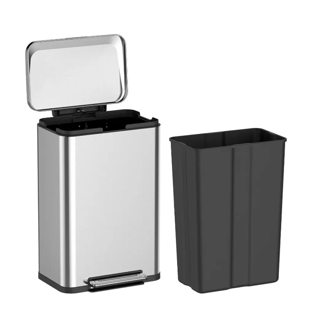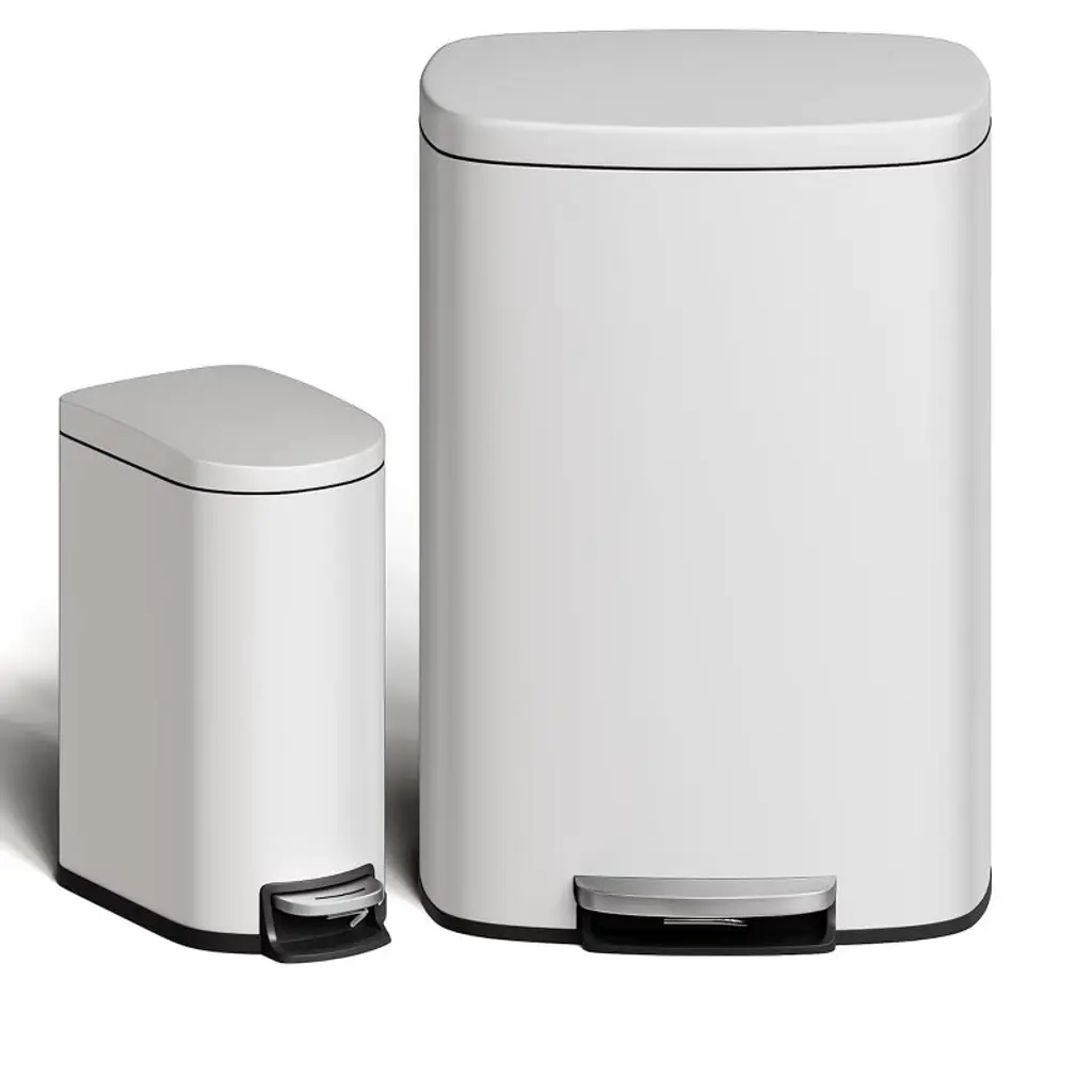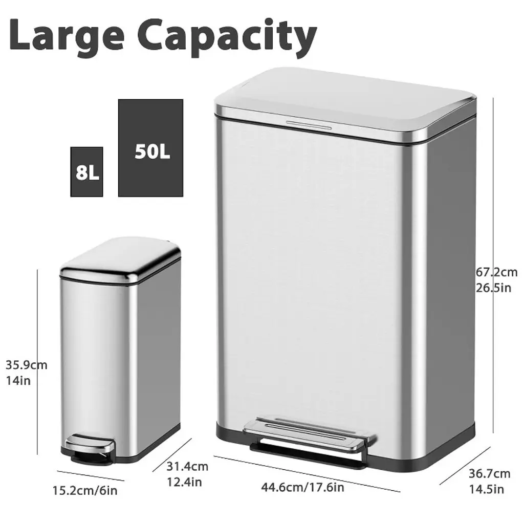 The Acekool 2-pack trash can set offers versatile waste disposal solutions for your home or office. The 13-gallon bin is ideal for kitchens, while the slim 2-gallon can fits tight spaces like bathrooms. Both trash cans feature fingerprint-resistant stainless steel exteriors and removable inner buckets for easy cleaning. The rectangular design maximizes space and complements modern décor. Slow-close lids keep noise to a minimum and steel pedals ensure hassle-free, touchless operation. This thoughtful set helps keep your spaces tidy, quiet, and hygienic without hassle.