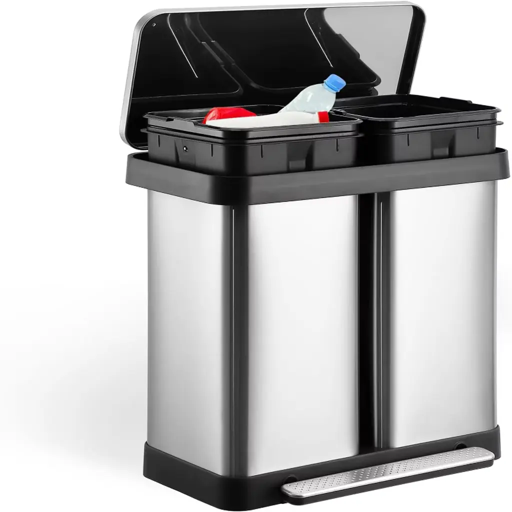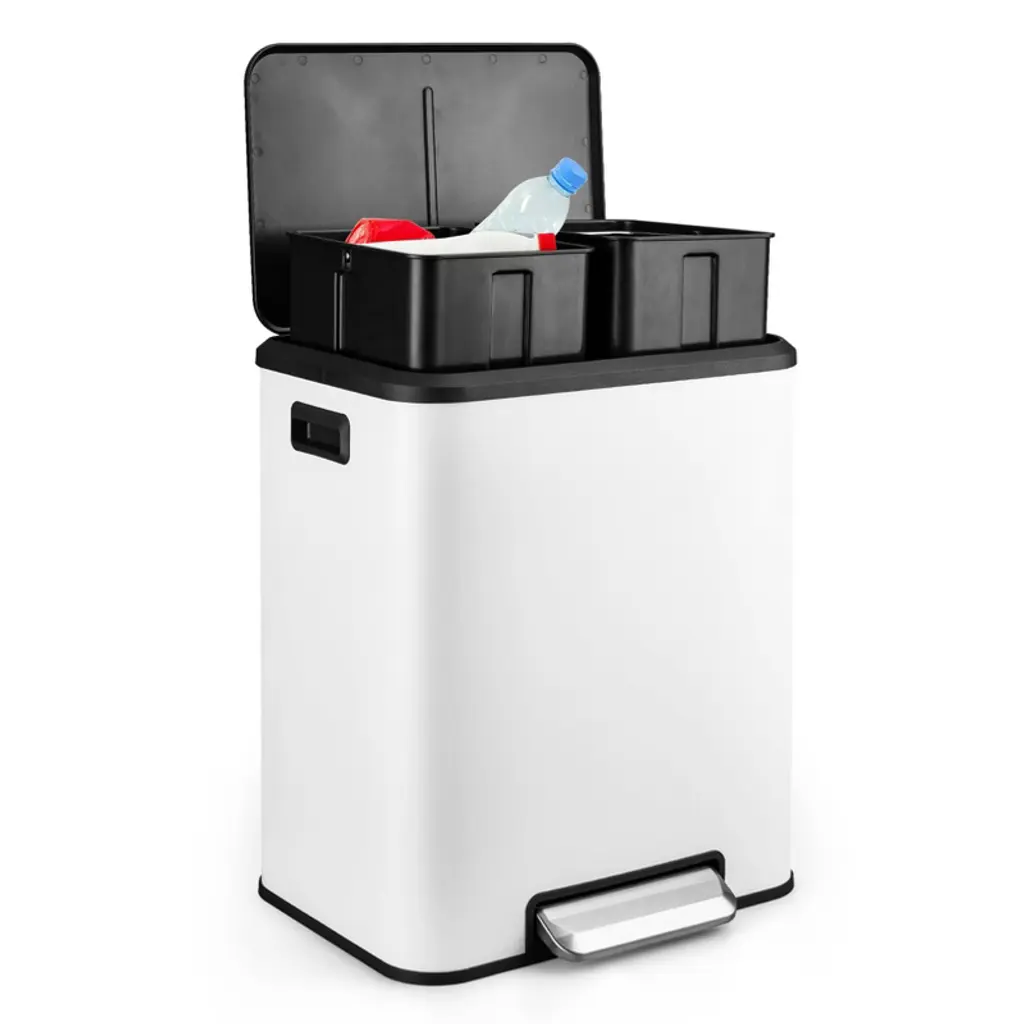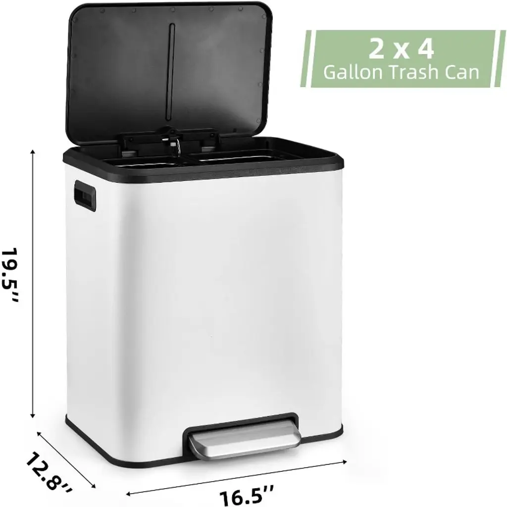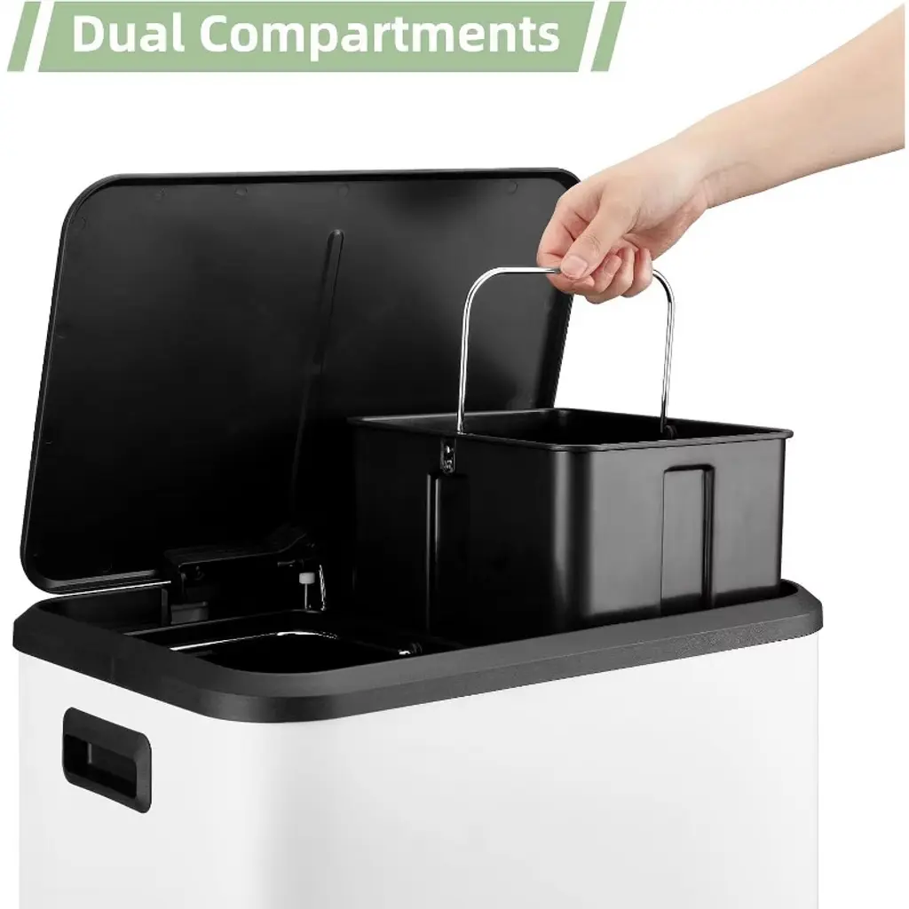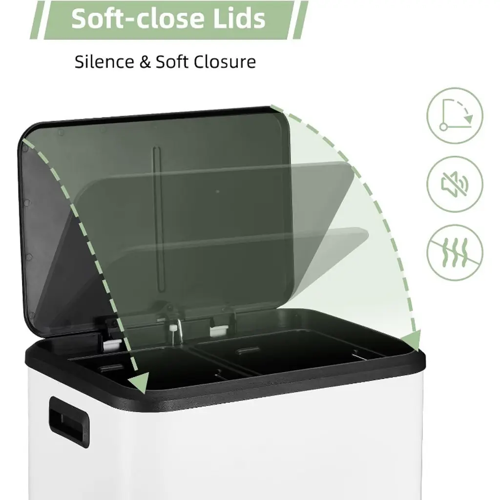 Acekool 30l Dual Compartment Trash Can With Soft-close Lid, Two Removable Buckets, Stainless Steel Garbage Bin For Kitchen & Home, White