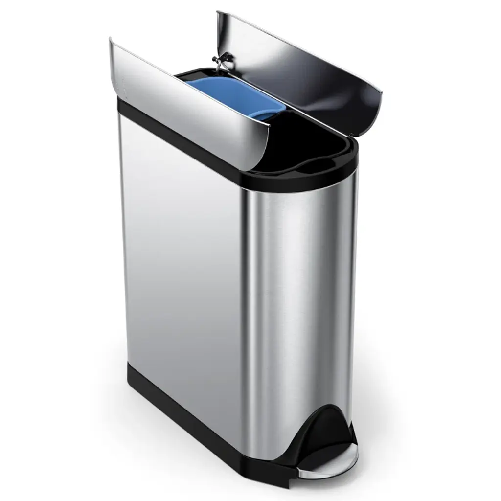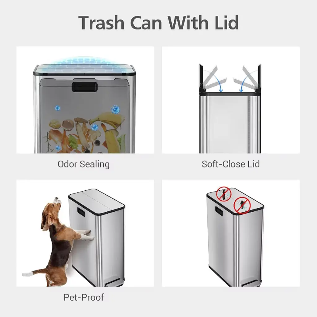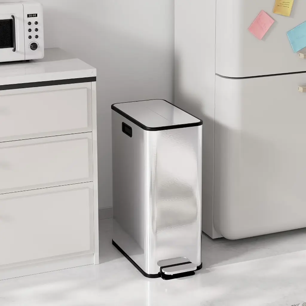 The Acekool 56L dual compartment trash can offers a practical and stylish solution for efficient waste management. Its slim profile and swing-open butterfly lid save space and make trash disposal simple. Equipped with two removable 7.4-gallon bins, this trash can supports easy sorting of recyclables and waste. The foot-operated lid ensures touchless use while sealing in odors. Measuring to fit well in compact kitchens or offices, this stainless steel bin resists fingerprints and cleans easily, enhancing both function and appearance in your room.