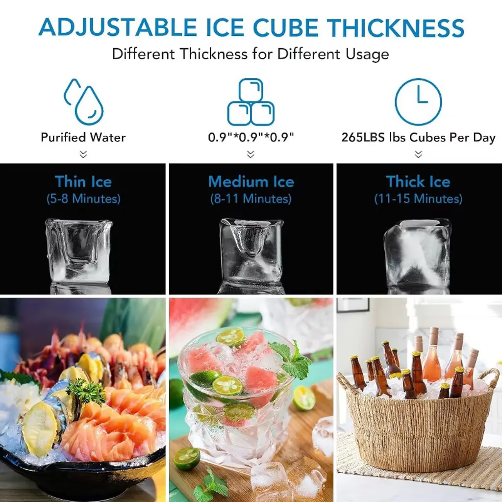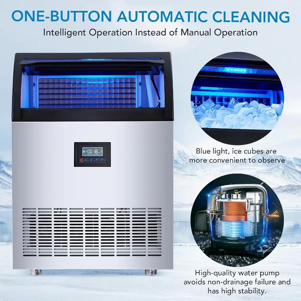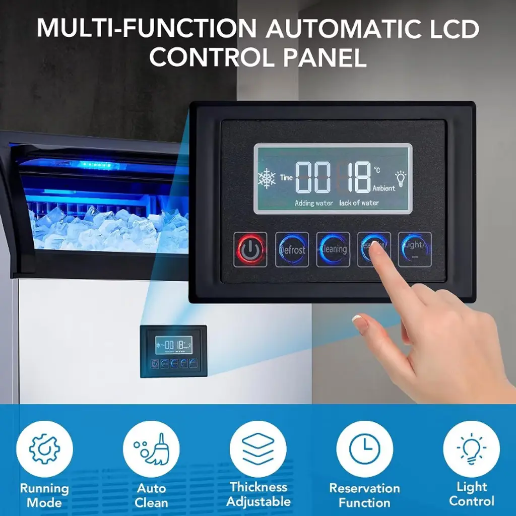 The Acekool 200Lbs Commercial Ice Maker meets the toughest demands with professional-grade performance. Its rapid cycle time and large storage capacity ensure you'll never run out during busy shifts or events. The dual water inlet options provide flexible installation for any space. User-friendly features include intuitive controls, visible ice level indicators, and easy-access storage. The commercial-grade stainless steel housing combines durability with easy cleaning, while the efficient compressor delivers quiet operation. Measuring compact enough for undercounter installation, this unit fits perfectly behind bars or in kitchen prep areas. The thoughtful design includes all necessary components for immediate setup and operation. Dimensions & Specifications: Unit Size: 21" W x 19" D x 35" H Daily Output: 200 lbs Storage Capacity: 33 lbs Ice Production: 45 cubes per cycle (12-15 minutes) Water Options: Direct connect or tank filling Included: Installation kit, ice scoop, water filter