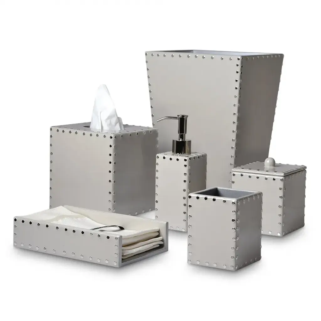 Aero represents the 'less is more' design attitude recently introduced by Mike + Ally. We use only the modern flat colors highlighted with choice of gold or silver metal studs....the perfect amount of restraint. Subtle and neutral for the contemporary bathroom interior. Established 30 years ago in New York, Mike & Ally is known worldwide for their elegant, handmade enamel and lucite bath accessories. All items custom made to order; please allow 6 weeks for delivery. Please make your selection carefully; orders cannot be cancelled once submitted and items are not returnable.