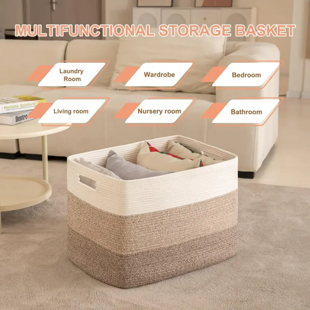 Upgrade your home organization with this extra-large 108L woven basket, perfect for storing blankets, toys, clothes, and more in style. Crafted from 100% natural cotton rope, it¡¯s soft, durable, and safe for kids and pets, featuring sturdy reinforced handles for easy transport. Its versatile, foldable, and washable design seamlessly fits any living room, bedroom, nursery, or laundry space while effortlessly maintaining its elegant shape.