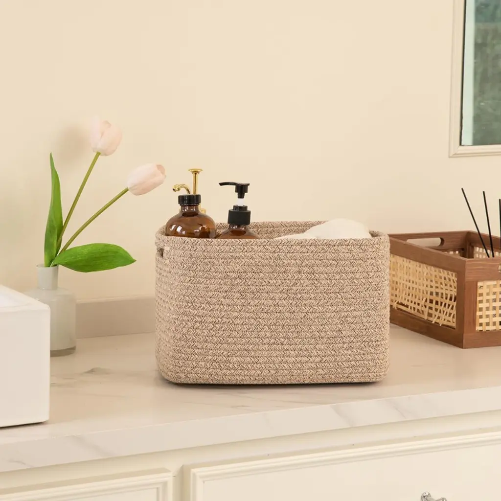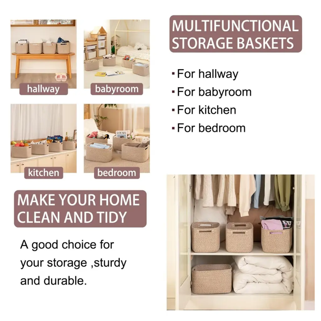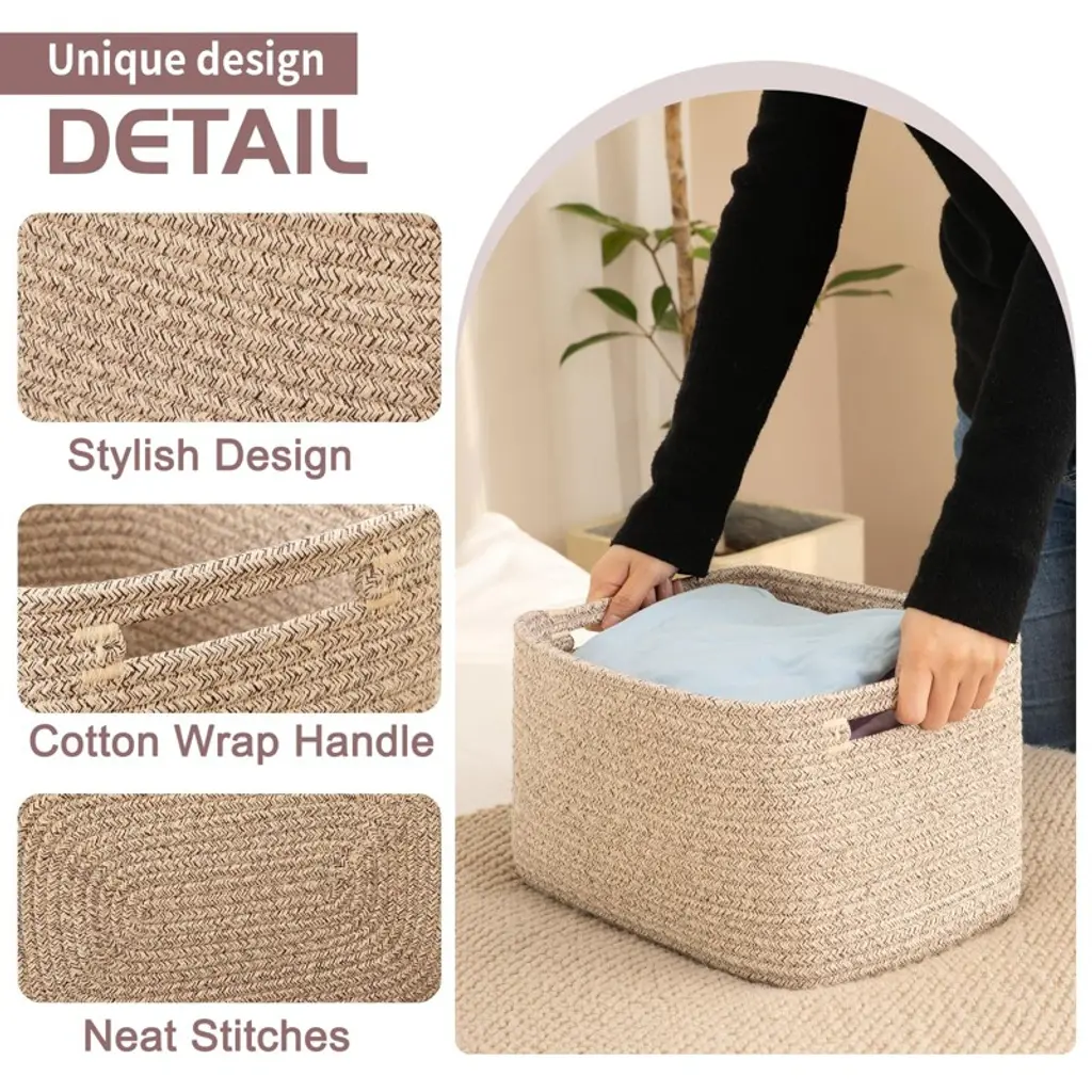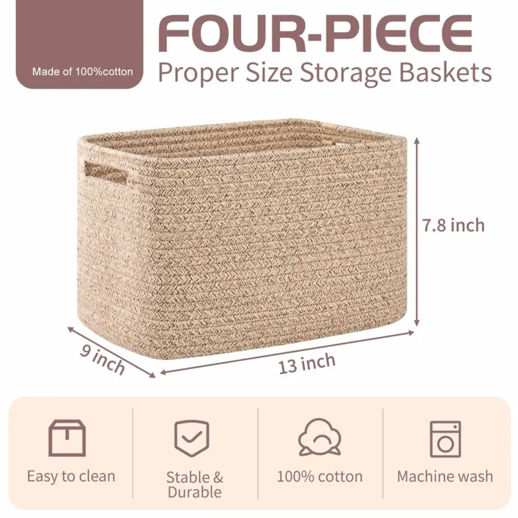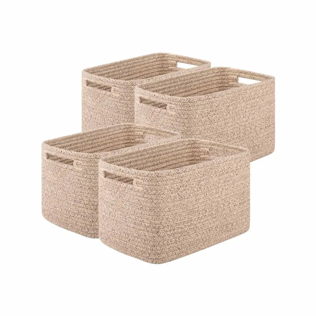 Aoibox 4 Pack Woven Cotton Rope Storage Baskets With Handles Brown Rectangle Cube Bins For Shelves Foldable 12.7x9x7.8