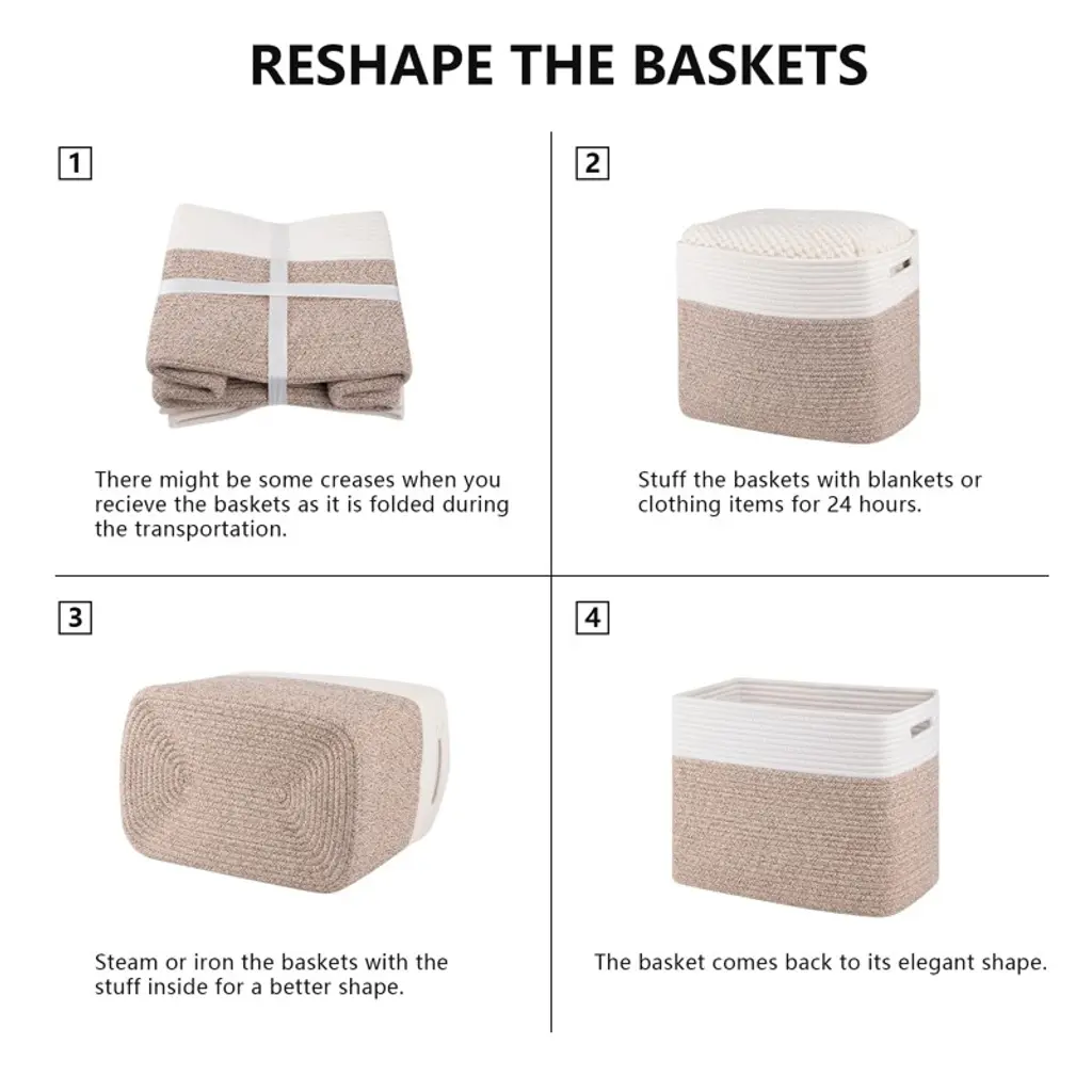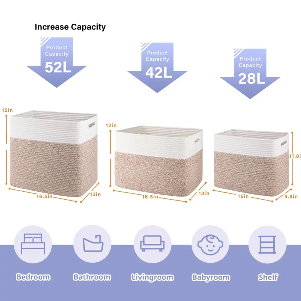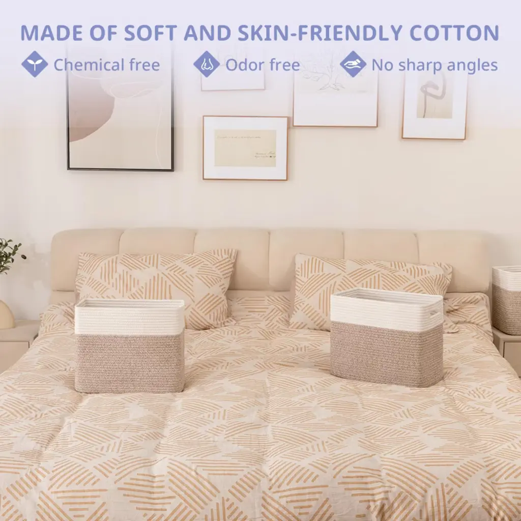 Upgrade your home organization with these stylish cotton rope storage baskets¡ªperfectly sized for shelves, closets, or any room in need of a tidy touch. Crafted from premium, chemical-free cotton and reinforced with sturdy handles, they offer safe, scratch-free organization for toys, blankets, clothes, and more. Their versatile neutral design and collapsible structure make them both decorative and practical for everyday living.