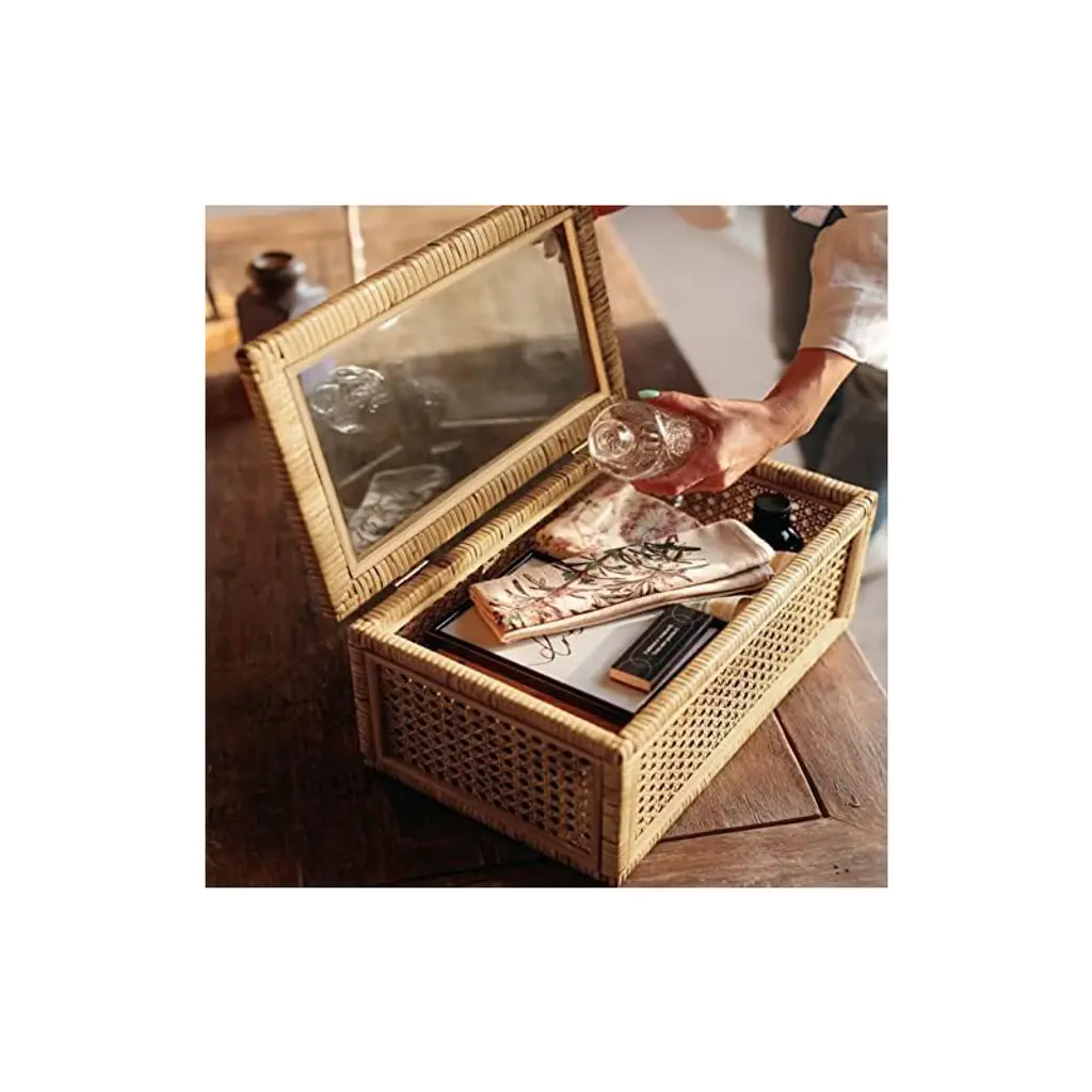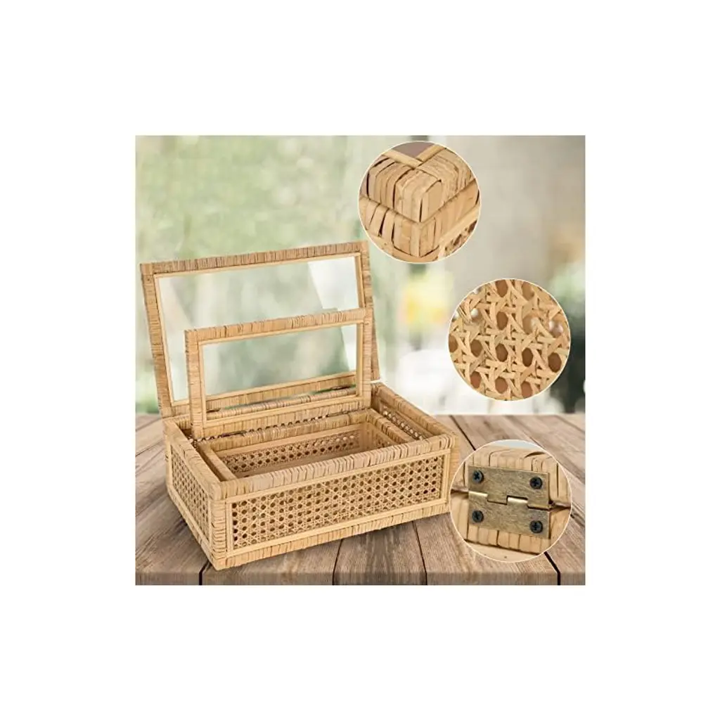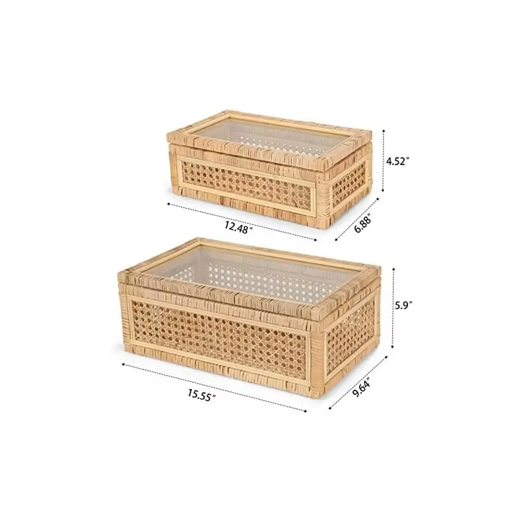 Aoibox Handwoven Boho Rattan Display Boxes With Glass Lids Set Of 2 Rectangular Storage Bins For Home Decor