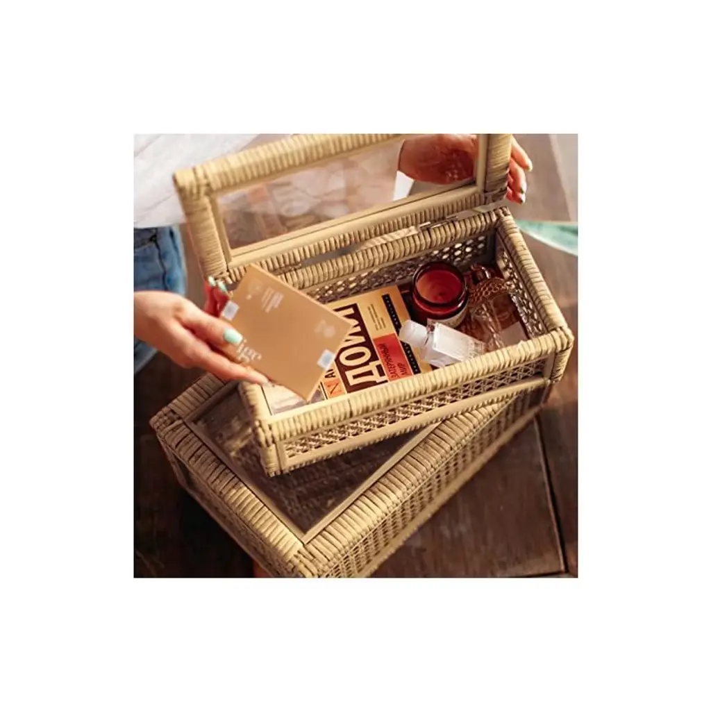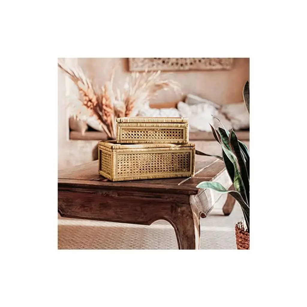 Elevate your home with this set of two handwoven rattan display boxes, expertly crafted to blend natural beauty with durable functionality. Show off your treasured keepsakes, jewelry, or photos through transparent glass lids, while intricate cane weaving and sturdy wooden frames bring authentic boho charm to any room. Perfect for shelves, tables, or entryways, these decorative organizers add rustic elegance and versatility to your living space.