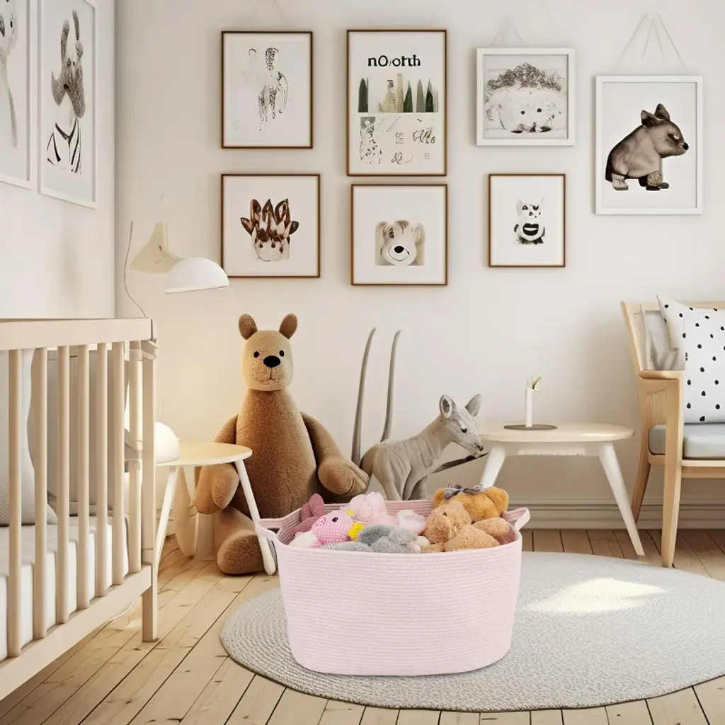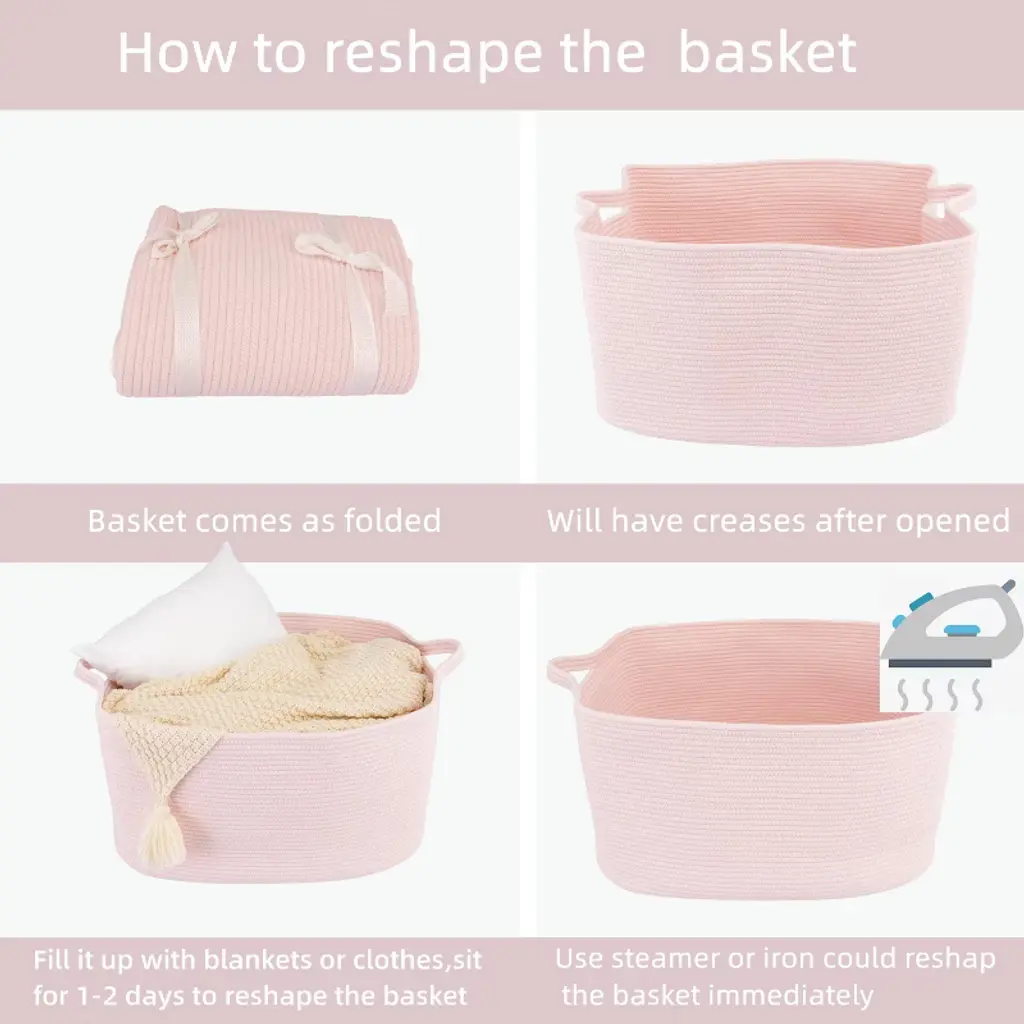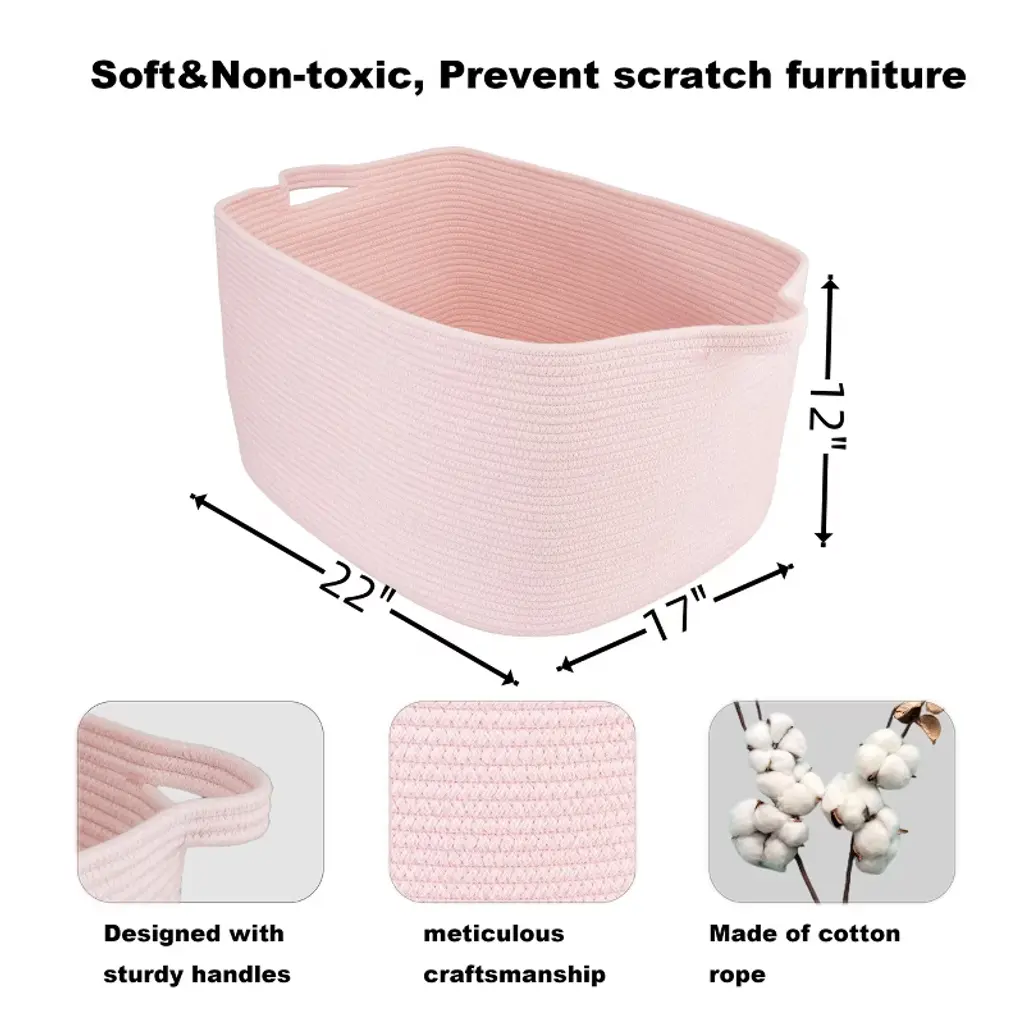 Organize your home in style with this spacious 22x17x12 woven cotton rope basket, perfect for toys, blankets, clothes, and more. Crafted from thick, non-toxic cotton, it¡¯s safe, durable, soft, and easy to transport thanks to sturdy handles¡ªideal for any nursery, bedroom, bathroom, or living room. Its elegant solid color design seamlessly blends with any decor, while the gentle material prevents scratches on furniture and floors.
