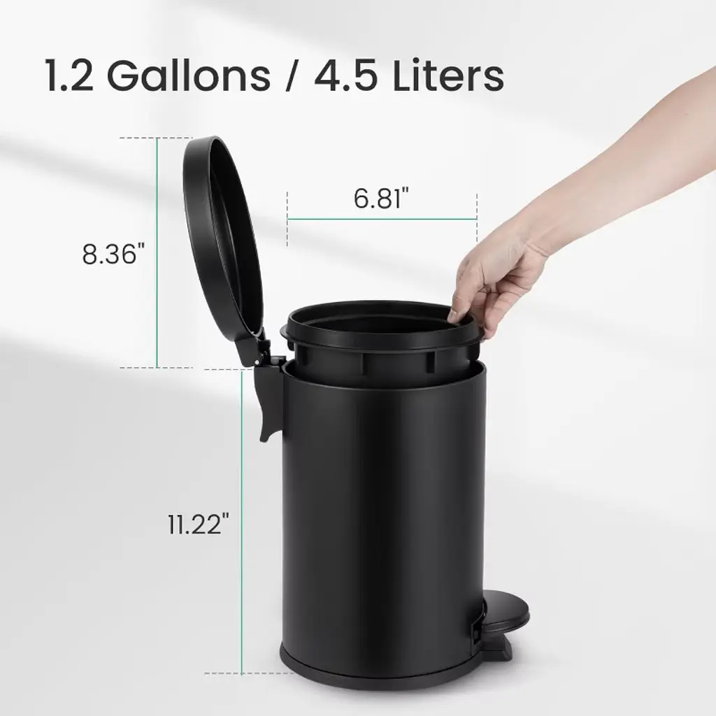 Aoibox Small Black Trash Can With Lid And Foot Pedal, Mini Round Wastebasket For Bathroom, Bedroom, Office, 1.2 Gallons Capacity, Matte Black
