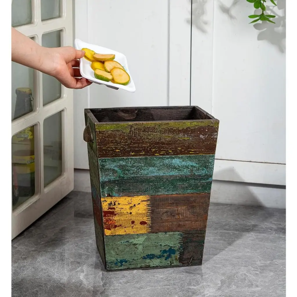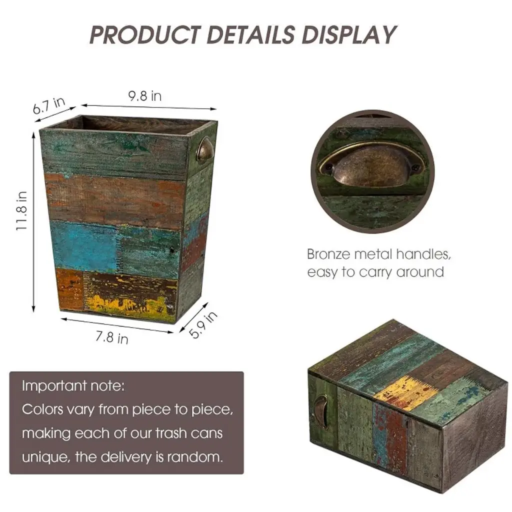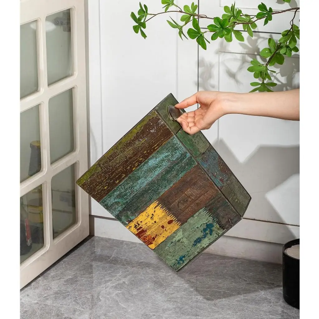 Discover a unique and practical addition to your home with this wooden wastebasket. Crafted from solid reclaimed wood, it combines sturdiness with style. Its vintage boho charm, created by a distressed look and a variety of textures and colors, makes it stand out. Each piece is handmade, so no two are alike, ensuring you own a truly unique item. This multi - functional wastebasket can be used as a trash can, recycling bin, or for storing household items like magazines and toys. It can even double as a flower planter, adding a touch of creativity to your decor. Ideal for bathrooms, kitchens, bedrooms, offices, and studies, it offers convenient trash disposal wherever you need it. And for lining, store shopping bags fit right in, making it easy to maintain. Upgrade your home organization and decor with this one - of - a - kind wooden wastebasket.