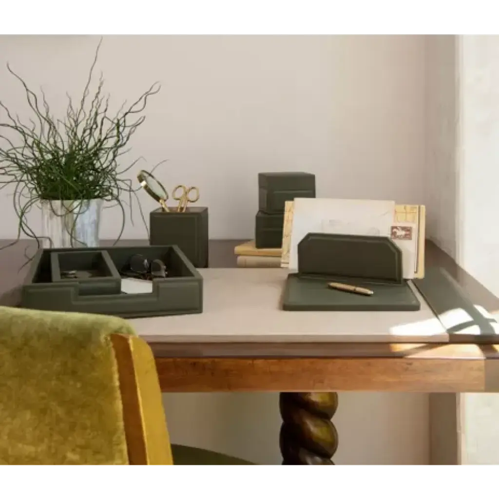 Stylize a study or elevate the details of a desk! Raised full-grain leather in a versatile green makes our Asby a refined collection for any client. Wastebaskets include gray powder coated metal liner. The designers at Pigeon & Poodle believe the details of a home are just as important as the furniture. A gorgeous toothbrush holder or handcrafted canister can elevate an entire bath, the perfect frame can heighten the feel of a whole space, and a good-looking storage basket can be your look’s missing link. With thoughtful design and top-notch craftsmanship, Pigeon & Poodle create home accessories with the care and attention typically reserved for larger pieces of décor.