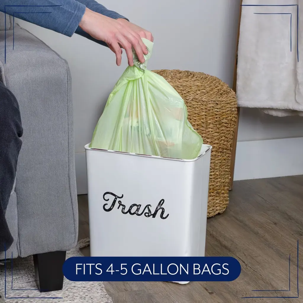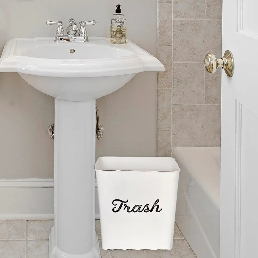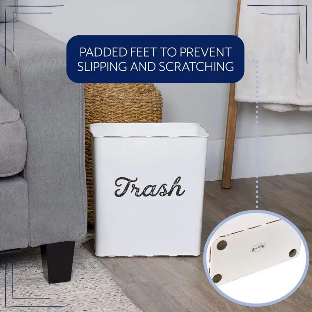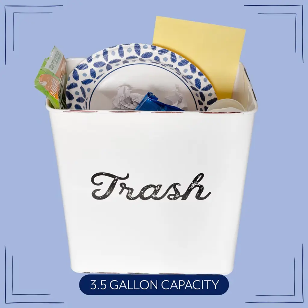 Complement your bathroom, bedroom, laundry room, office or dorm room with this charming waste basket. This is made of sturdy steel with a timeless vintage style perfect for modern farmhouse and classic, retro decor. Designed with no lid, this standing, open-top garbage bin allows you to dispose of your trash with ease. Holds 3.5 gallons.