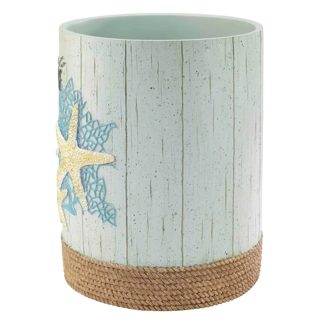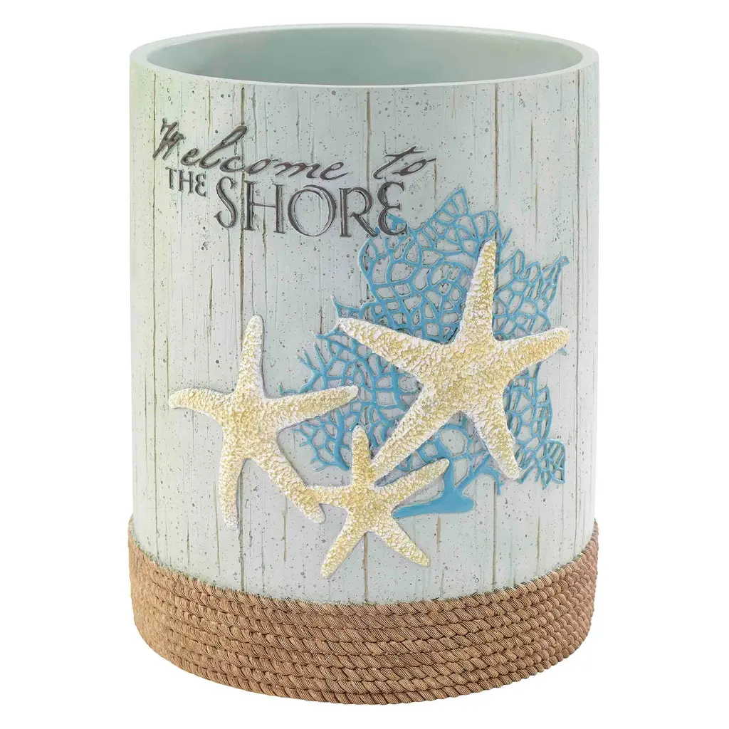 The Avanti Beachcomber Wastebasket sports a starfish and coral motif in off-white, beige and teal and "Welcome to the Shore" on an aqua clapboard background. It's finished with a rope border at the bottom. Crafted in durable hand-painted resin for easy care and long life.