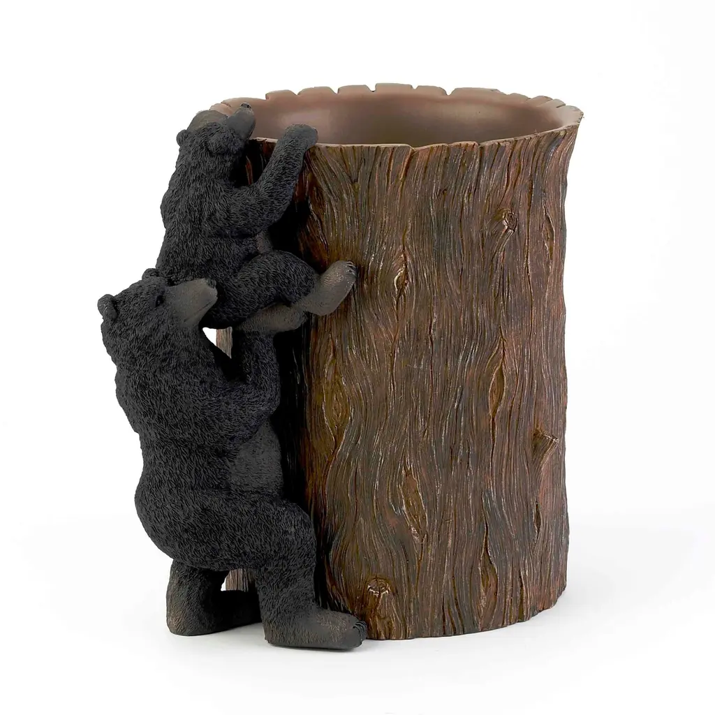 The Avanti Black Bear Lodge Wastebasket features a mother black bear helping her cub to climb up the side of a life-like tree. Made of hand-painted resin for easy care and long life. Coordinating shower curtain, accessories, towels and rug available.