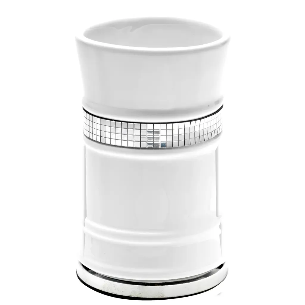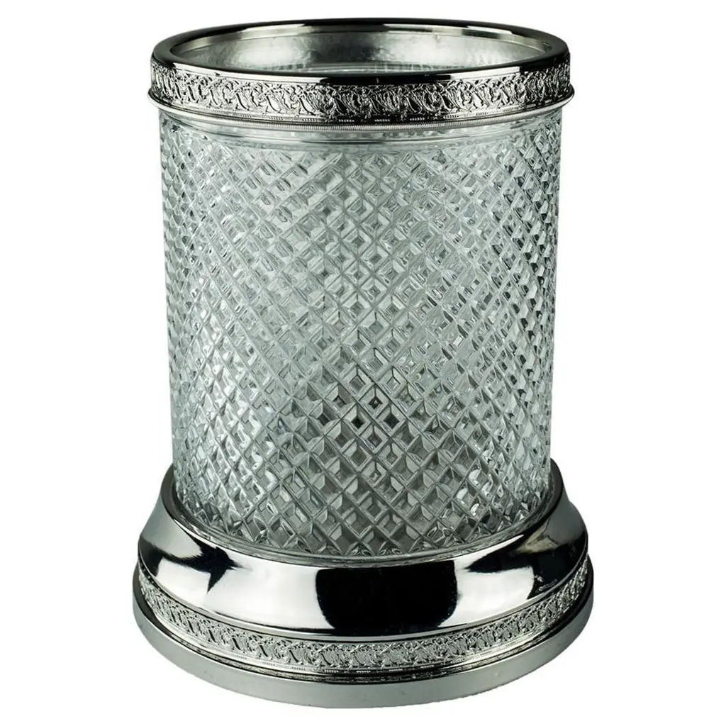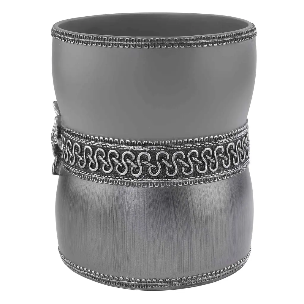 The Avanti Braided Medallion Granite Wastebasket features a two-tone color-block design of light and dark grey separated by a braid and medallion. A small braid decorates the top and bottom edges. Made of durable hand-painted resin for easy care and long life.