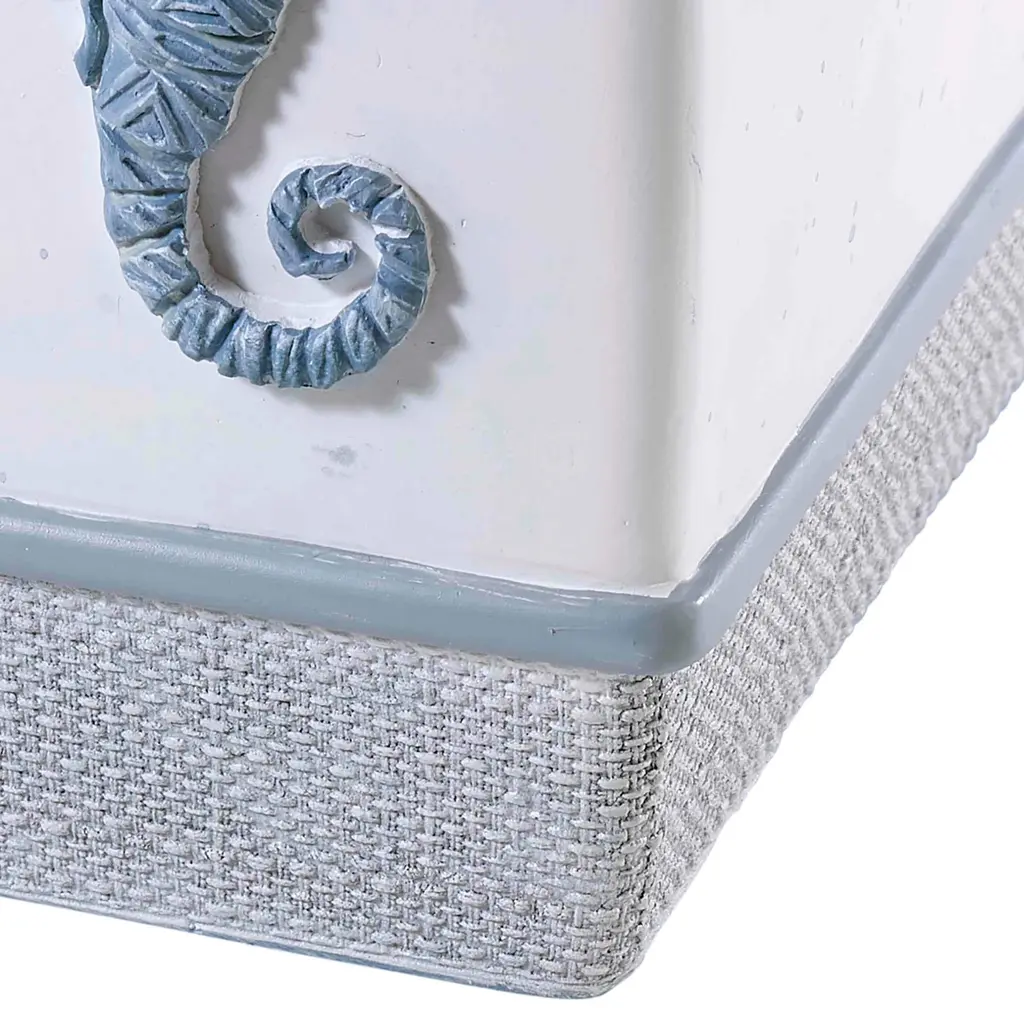 The Avanti Caicos Wastebasket features a sea turtle and seagrass in shades of blue in relief on speckled blue and white base. The turtle's shell is a mosaic made out of green and blue glass chips with a coordinating faux textured border at the bottom. Made of durable, hand-painted resin.