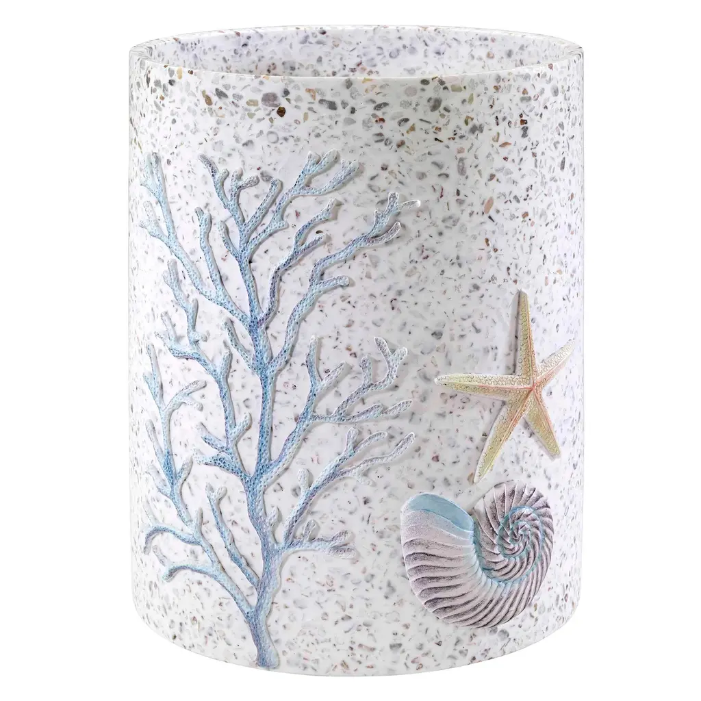The Avanti Coastal Terrazzo Decorative Wastebasket features a raised nautilus, starfish and coral design on a multi-color terrazzo. The terrazzo base is created from white resin mixed with colored stones. Coordinating shower curtain, towels, rug and accessories available.