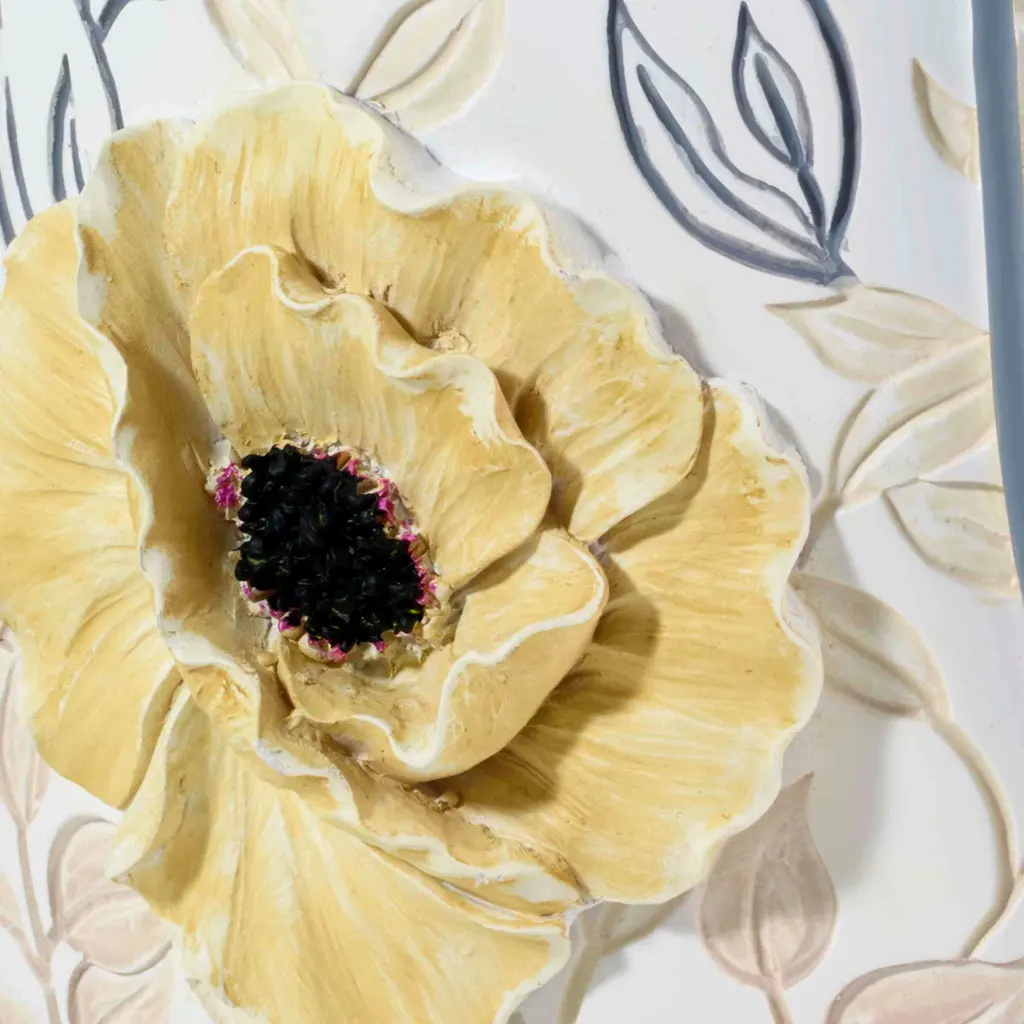 The Avanti Marielle Wastebasket features 3-dimensional yellow flowers with a grey stems on a smooth off-white ground. A yellow and grey embossed leaf and vine pattern wraps around the piece. Made of durable, hand-painted resin, wipe clean.