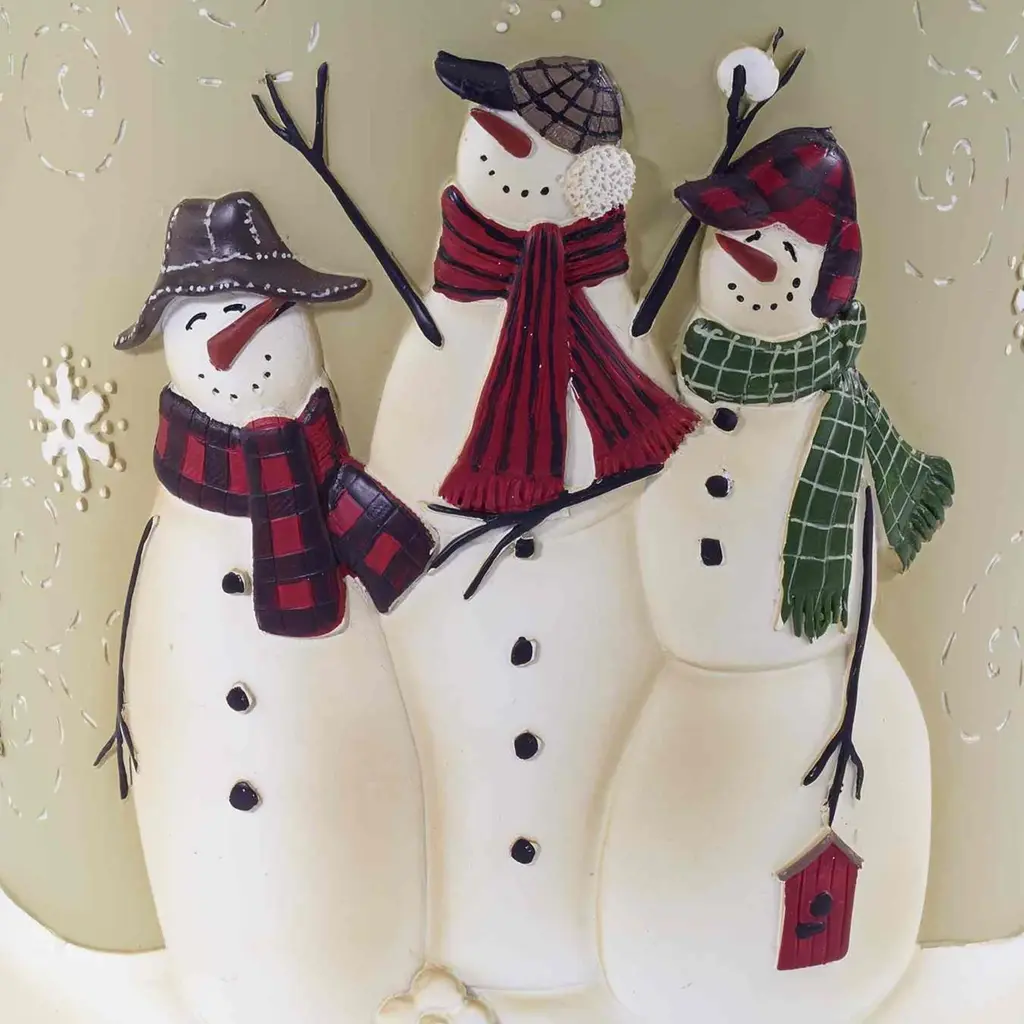The Avanti Snowmen Gathering Wastebasket features 3 raised, smiling, fully accessorized snowmen with pine trees and snowflakes on a tan background with white snow base. Crafted in hand-painted resin. Coordinating accessories, shower curtain, rug and towels also available.