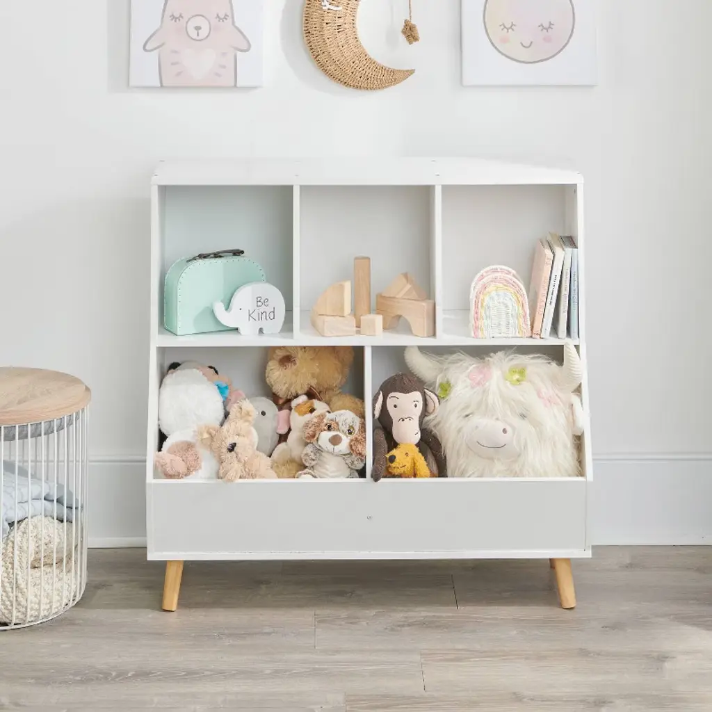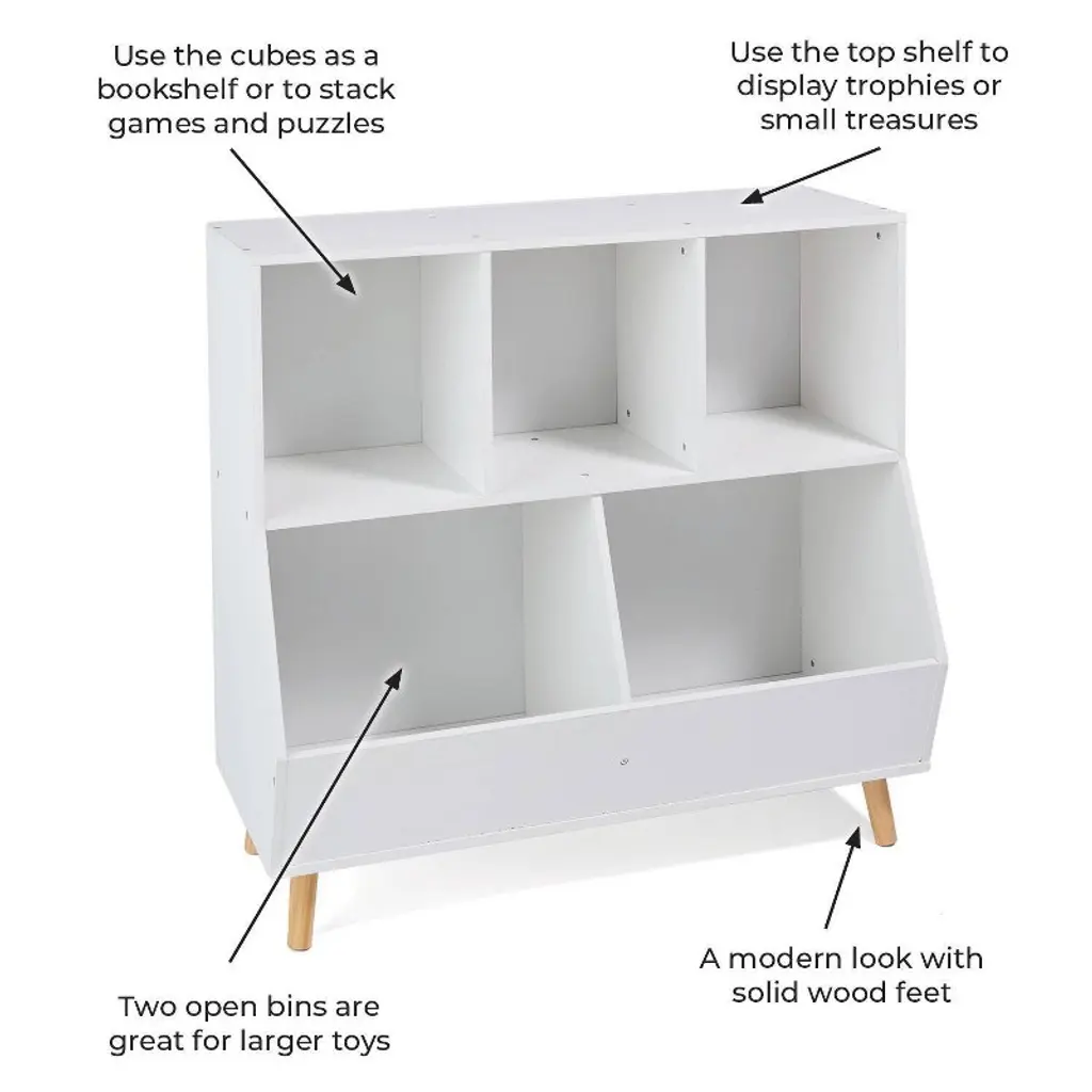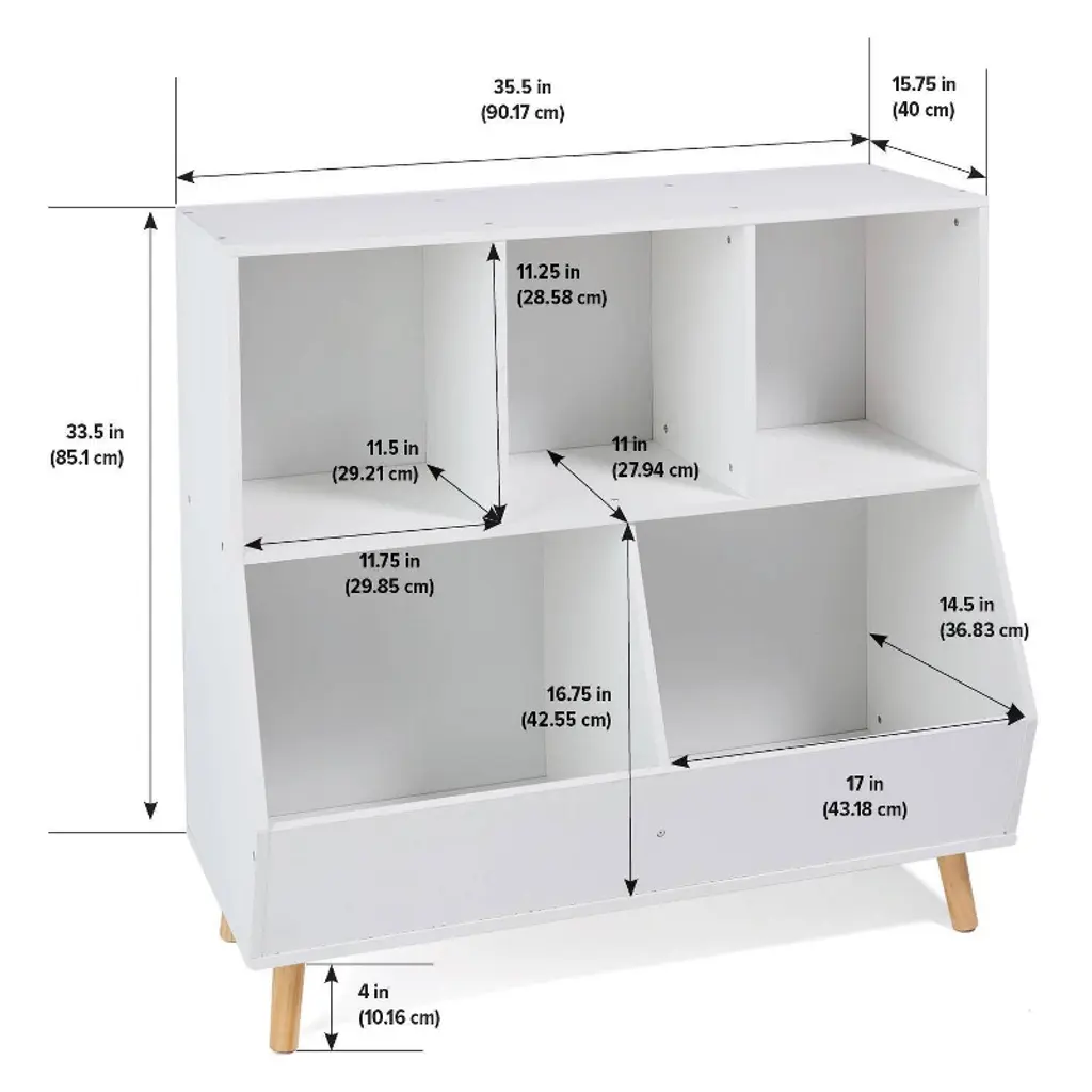 The Badger Basket Storage Organizer is a convenient all-in-one storage unit that makes clean up fun and easy for kids. This spacious organizer includes five handy storage bins and will help you keep your living room or playroom tidy, clutter free, and looking great! It features two large open-mouth bins that are perfect for larger toys like stuffed animals, dolls or trucks. It also has three square cubbies for books, puzzles and other toys your child can easily access. The modern look features four sturdy wooden feet to keep it off the floor so your child can see all of their toys without struggling to reach them. Made with a smooth and easy-to-clean melamine surface, the toy storage station will withstand years of play. Overall dimensions 35.5"L x 15.75"W x 33.5"H. Two large bins measure 17"L x 14.5"W x 16.75"H. Three square bins measure 11.75"L x 11.5"W x 11.25"H. Assembled weight is 36.5 lbs. All measurements approximate. Wipe clean with a lightly dampened cloth and mild detergent as needed and dry thoroughly. Adult assembly required. Illustrated assembly instructions included. Non-toxic finish. Product complies with all currently applicable safety standards and CARB ATCM standards. Product may vary slightly from shown and described. Props/accessories shown are for illustration purposes only and are not included with the product. Actual color/finish may vary slightly from screen display. This item ships in its original carton that may include a product photo.