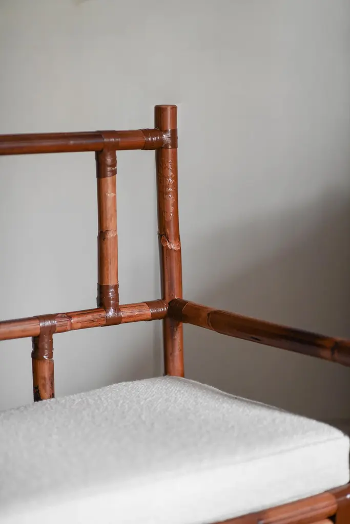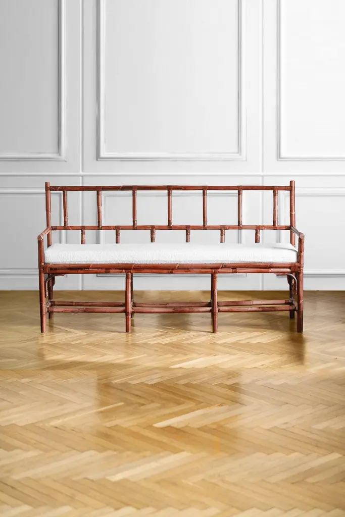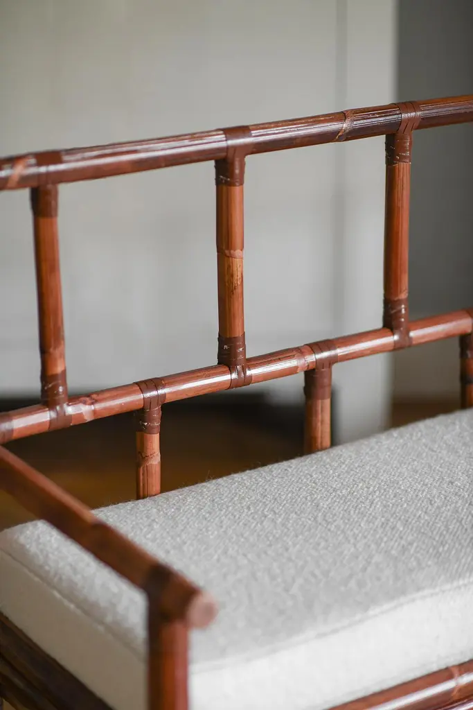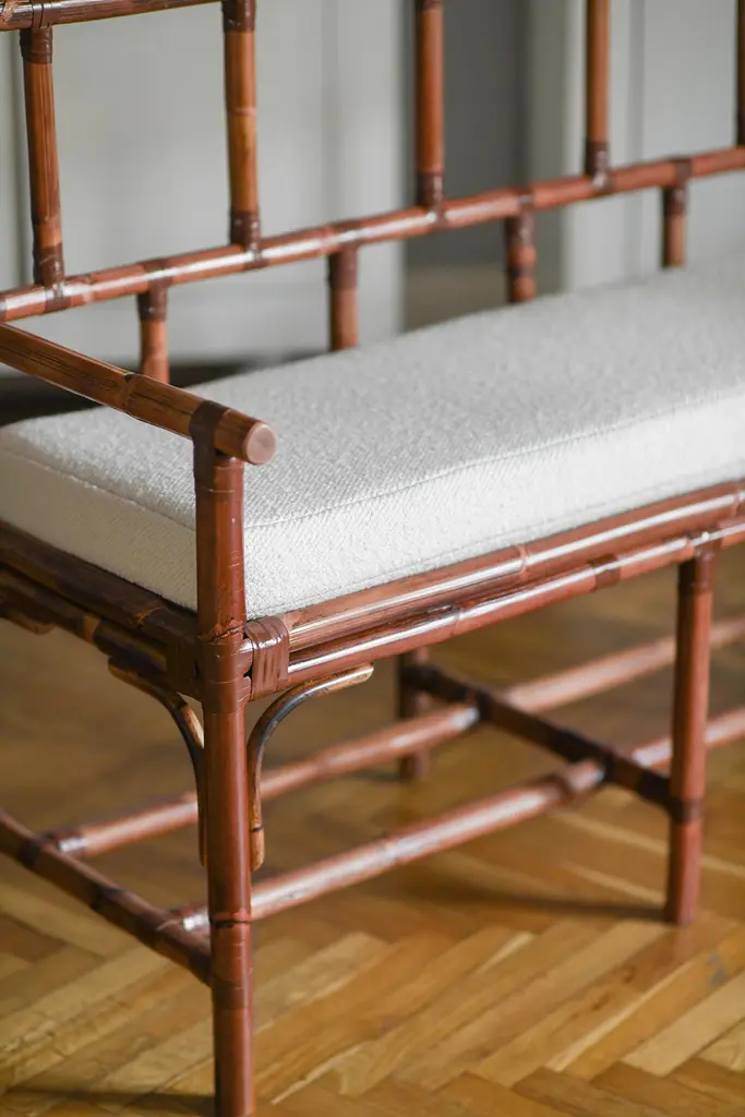 Bamboo bench with leather bindings made in our artisan workshopsin limited edition. Complete with cushion made in Dedar® fabric.Dimensions: 170w x 96h x 50d cmMaterials: bamboo, leatherColor of the fabric can be customized upon request. The bench is also available without cushion. Please contact us for more information and customization options
