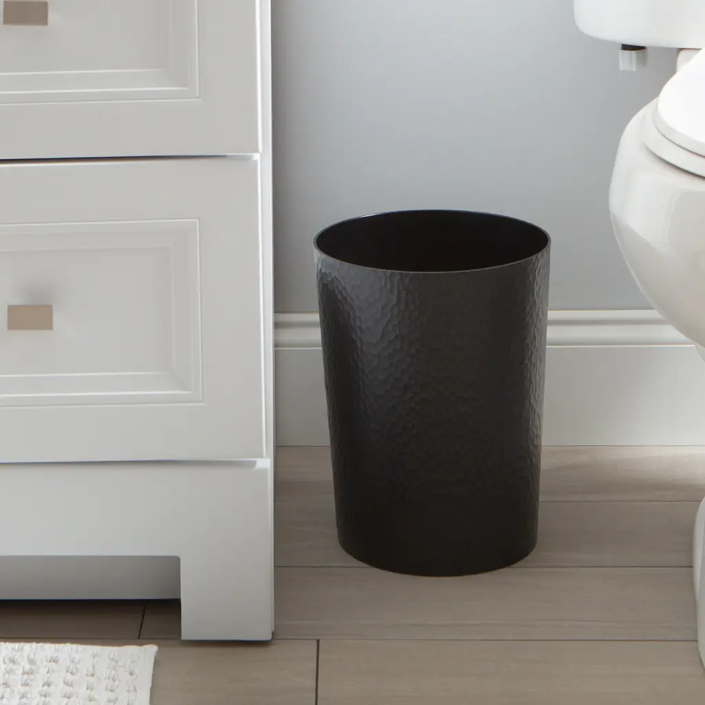 This Bath Bliss Trash Can is designed to complement any home or bathroom décor. Made of hammered textured plastic it is sure to glam up any space. The compact design is great for any small space such as a bathroom, office or dorm room. You can tuck the waste basket behind the toilet or under the sink. Keep your space looking clean.