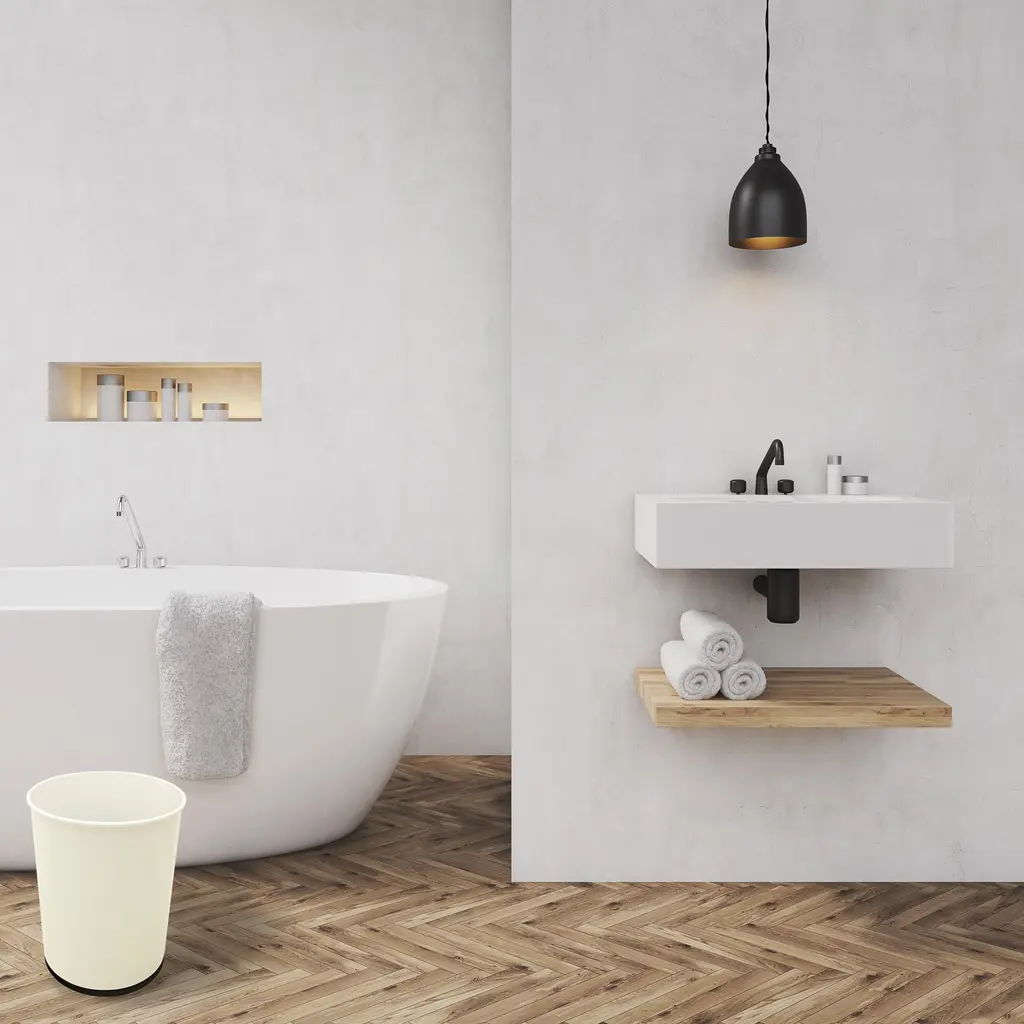 Stash your bathroom waste in style with this traditional white trash can. Constructed of sturdy, rust-resistant stainless steel, this trash can is built to last. Features: Type: Bathroom Organizers Material: Stainless Steel Style: Traditional Color: White Dimensions: 7.9 inches in diameter x 10 inches high