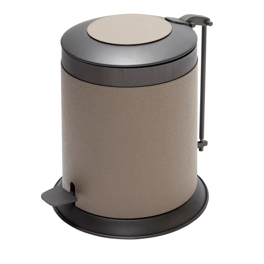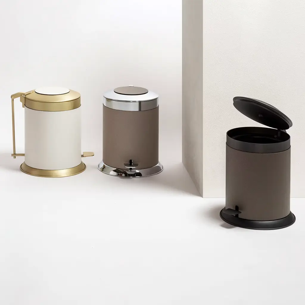 Metal structure available in different finishes featuring leather inserts. Removable dark-lacquered metal inner container for an easy cleaning.