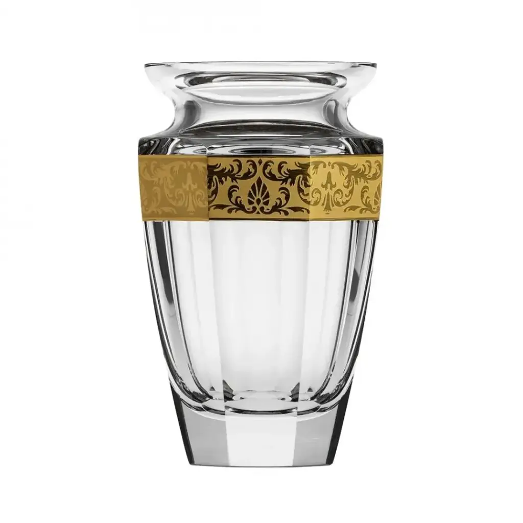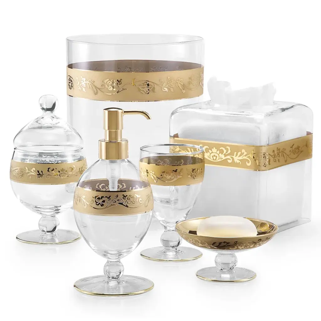 This elegant glass wastebasket features a gold and platinum band etched with garlands. The glass is mouth-blown and shaped by hand, making each piece unique.