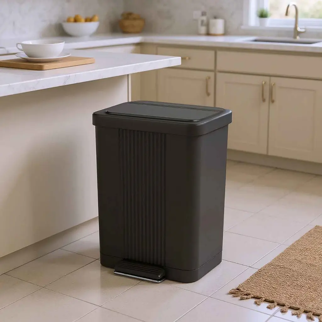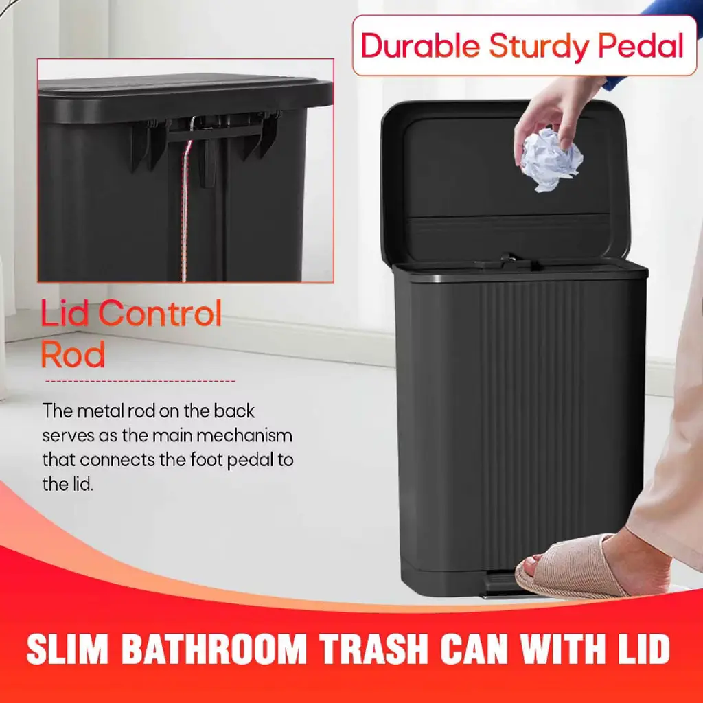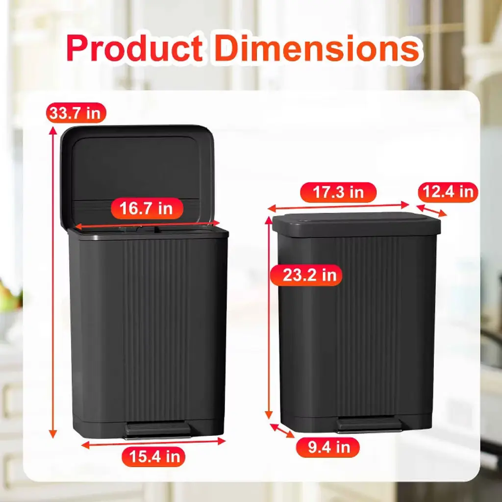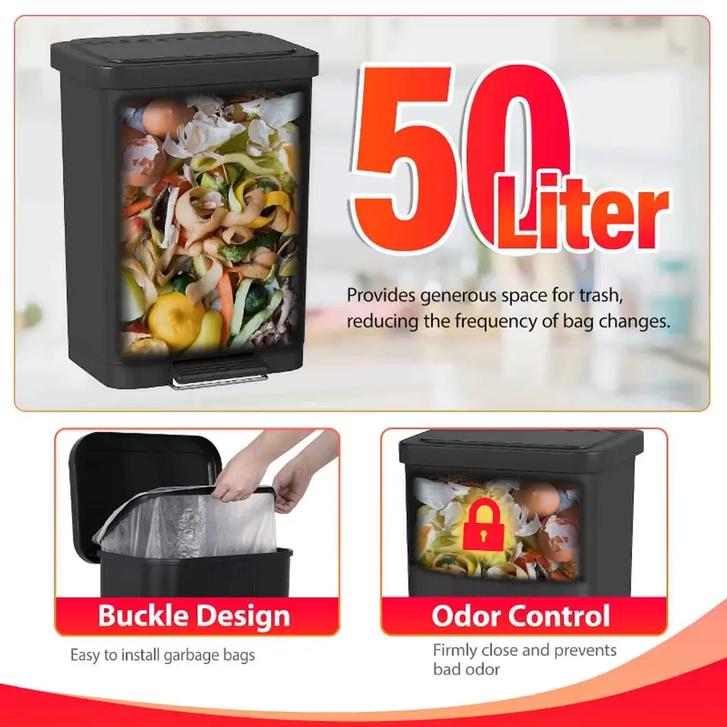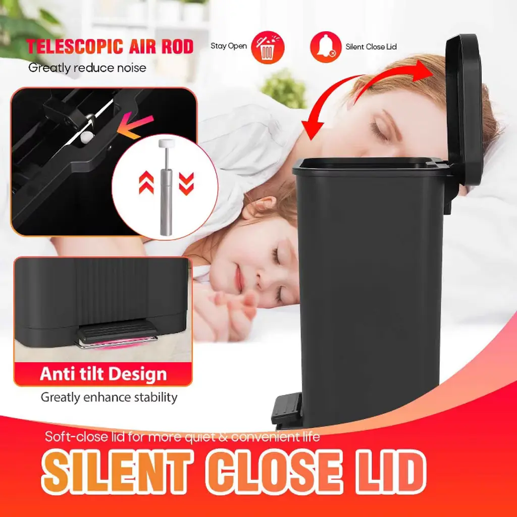 This 13-gallon (50-liter) high-capacity trash can is designed for modern households and office environments, combining practical functionality with aesthetic appeal. Its innovative foot pedal design allows hands-free operation, keeping your space clean and hygienic without the need to bend over. Made from premium PP material, the trash bin offers exceptional impact resistance and waterproof durability. The unique slow-close silent technology ensures the lid closes gently and quietly, preventing disturbances at home or in the office. A sturdy anti-tip base and secure buckle design enhance stability, making it a seamless and essential addition to kitchens, bathrooms, offices, or outdoor spaces.