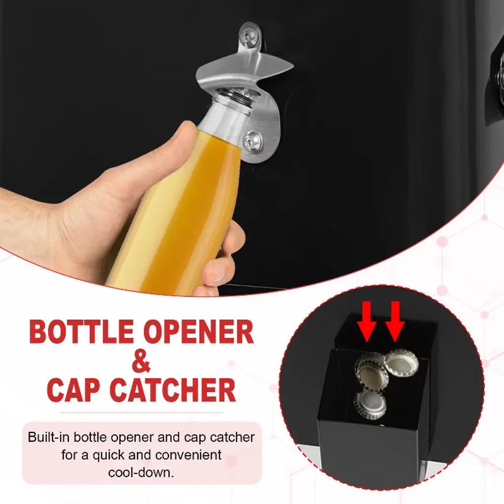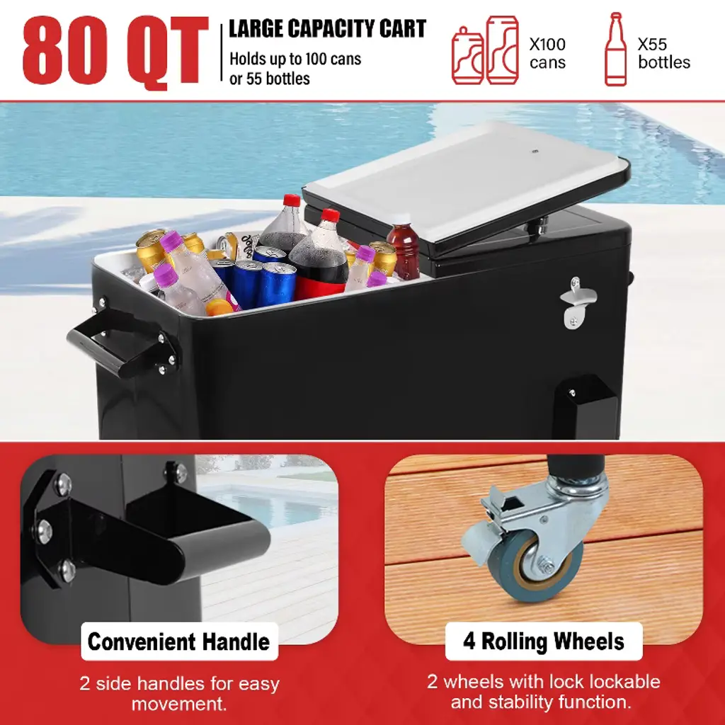 BestMassage Cooling Bin is a durable outdoor cooler cart with an 80-quart capacity, perfect for outdoor gatherings. It features a built-in bottle opener and cap catcher, and lockable casters for easy mobility. Made from high-quality metal, it can keep beverages cool for up to 48 hours or warm for up to 8 hours. Perfect for backyard barbecues, beach trips, or camping trips, it's the perfect companion for outdoor adventures.