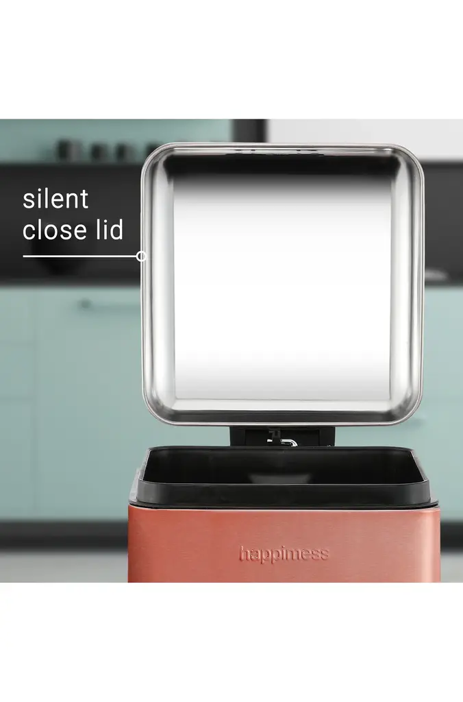 Our sleek rose gold trash can combines quality construction with mid-century modern styling for a small kitchen, bathroom, bedroom, or office. The soft finish makes a wonderful accent, and the tall shape fits easily into a small space. Dispose of trash hands-free with the convenient step pedal.Rose gold and black with a glossy finishRustproof stainless steel constructionSoft-close feature eliminates slamming -- making it less noisy, and safer for familiesDimension: 17.13 inches H x 9.45 inches D x 11.81 inches WColor: Rose GoldContent: Stainless steel/Polypropylene/ABSItem Weight: 4.2 lbs.Minor Assembly Required (no tools needed)