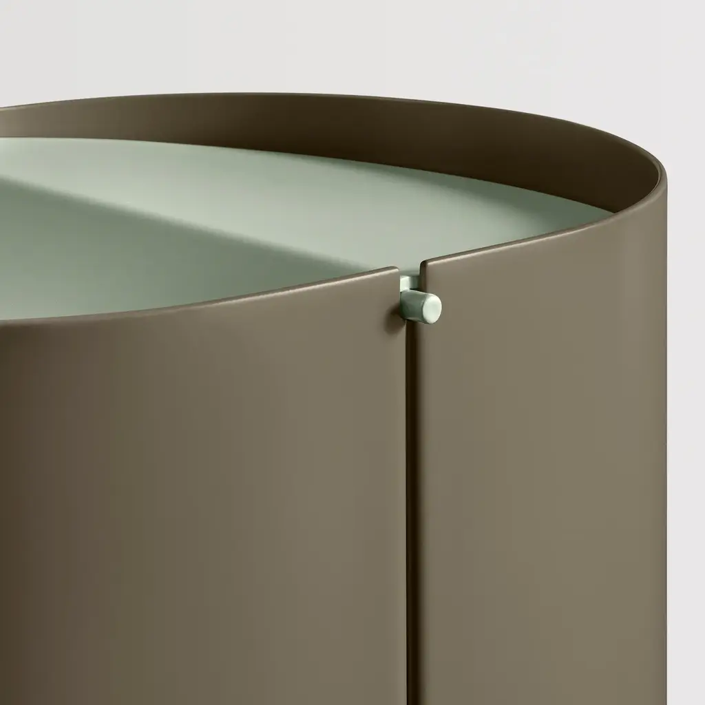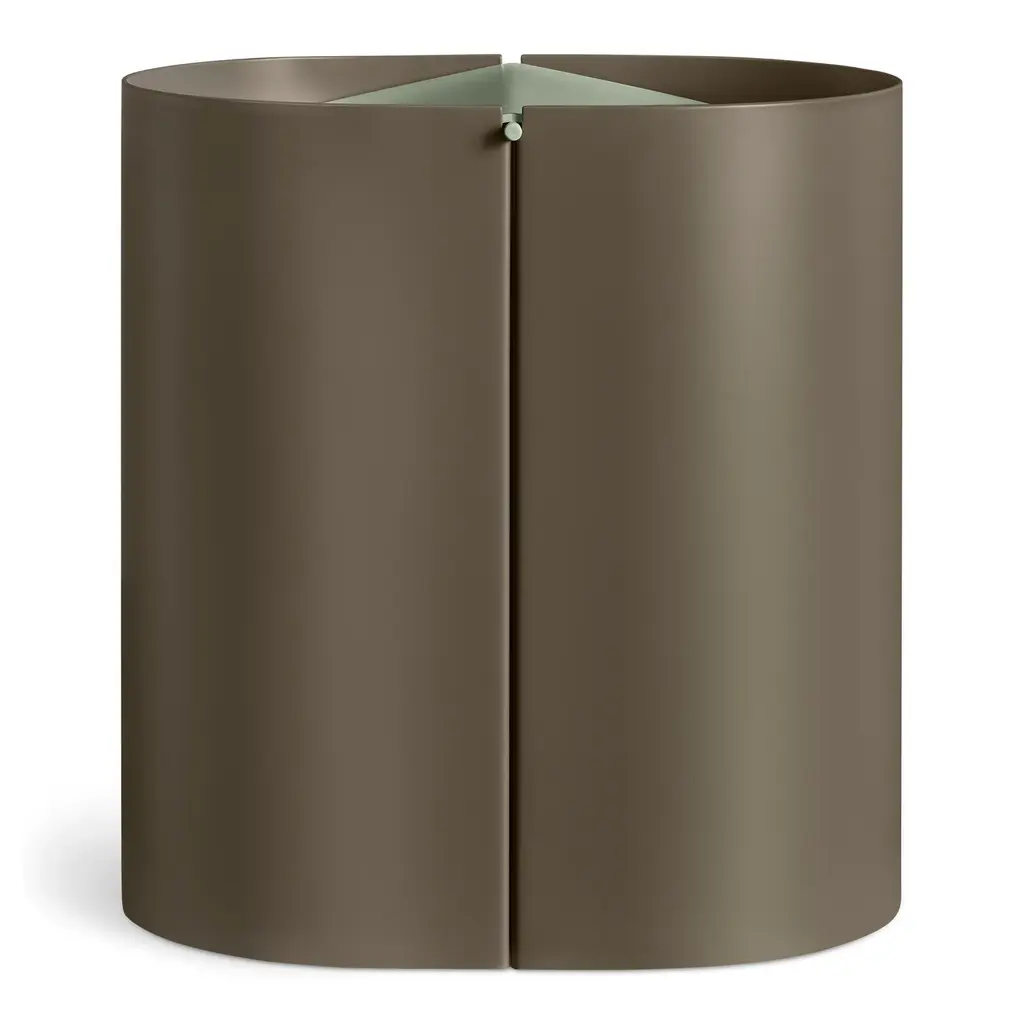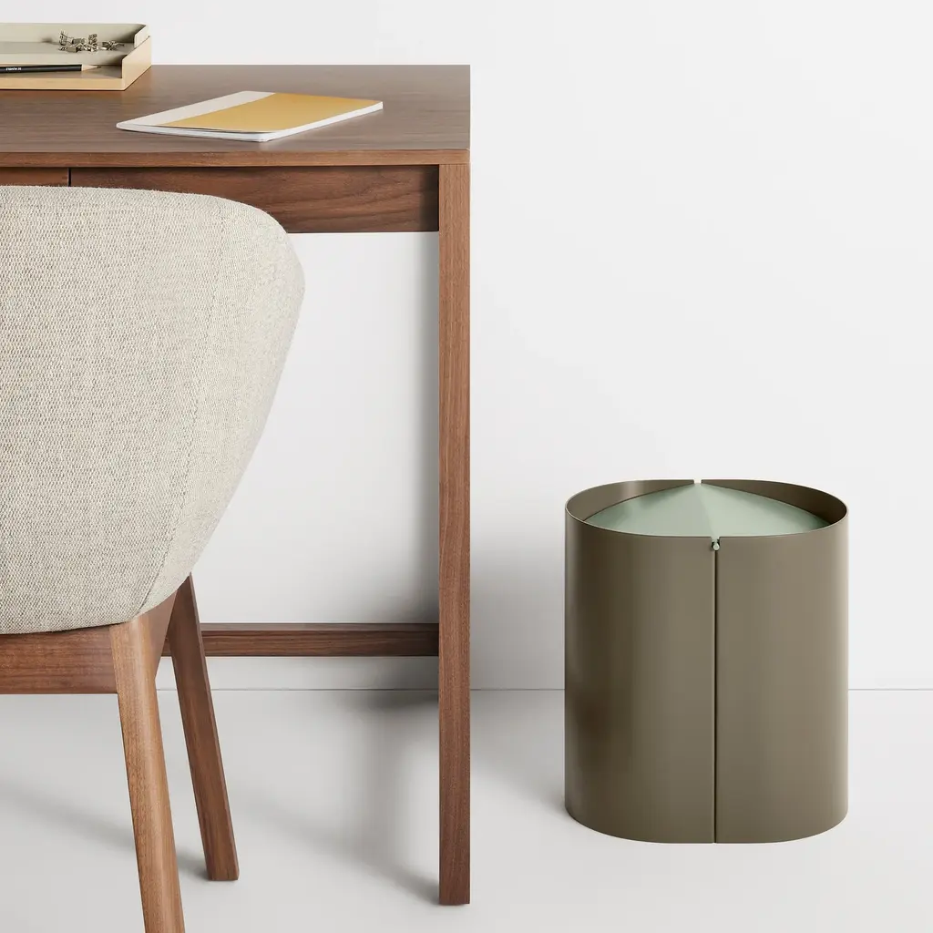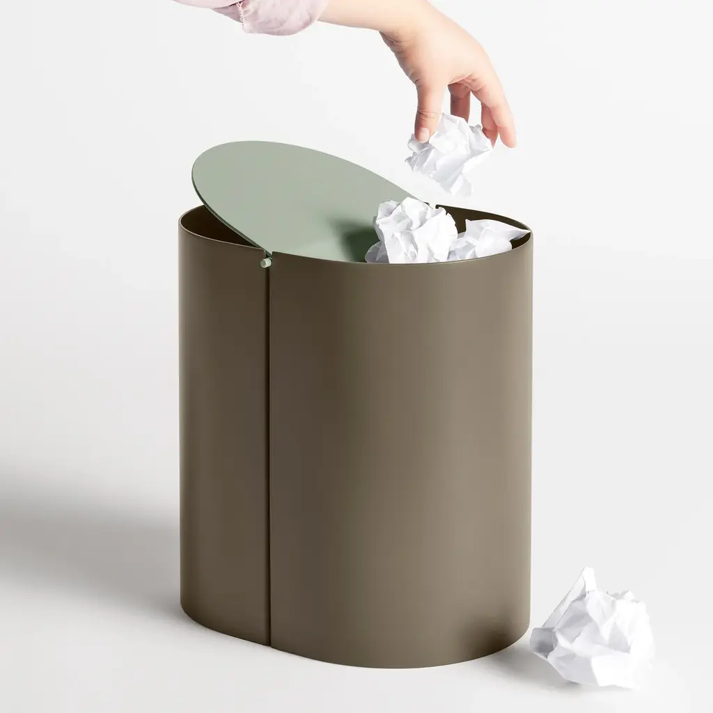 Your bin need not look like garbage. Two-tone powder-coated aluminum adds a pop of color to keep trash collecting cute. Swing-top lid neatly conceals your candy wrappers and provides hours of paper tossing fun.