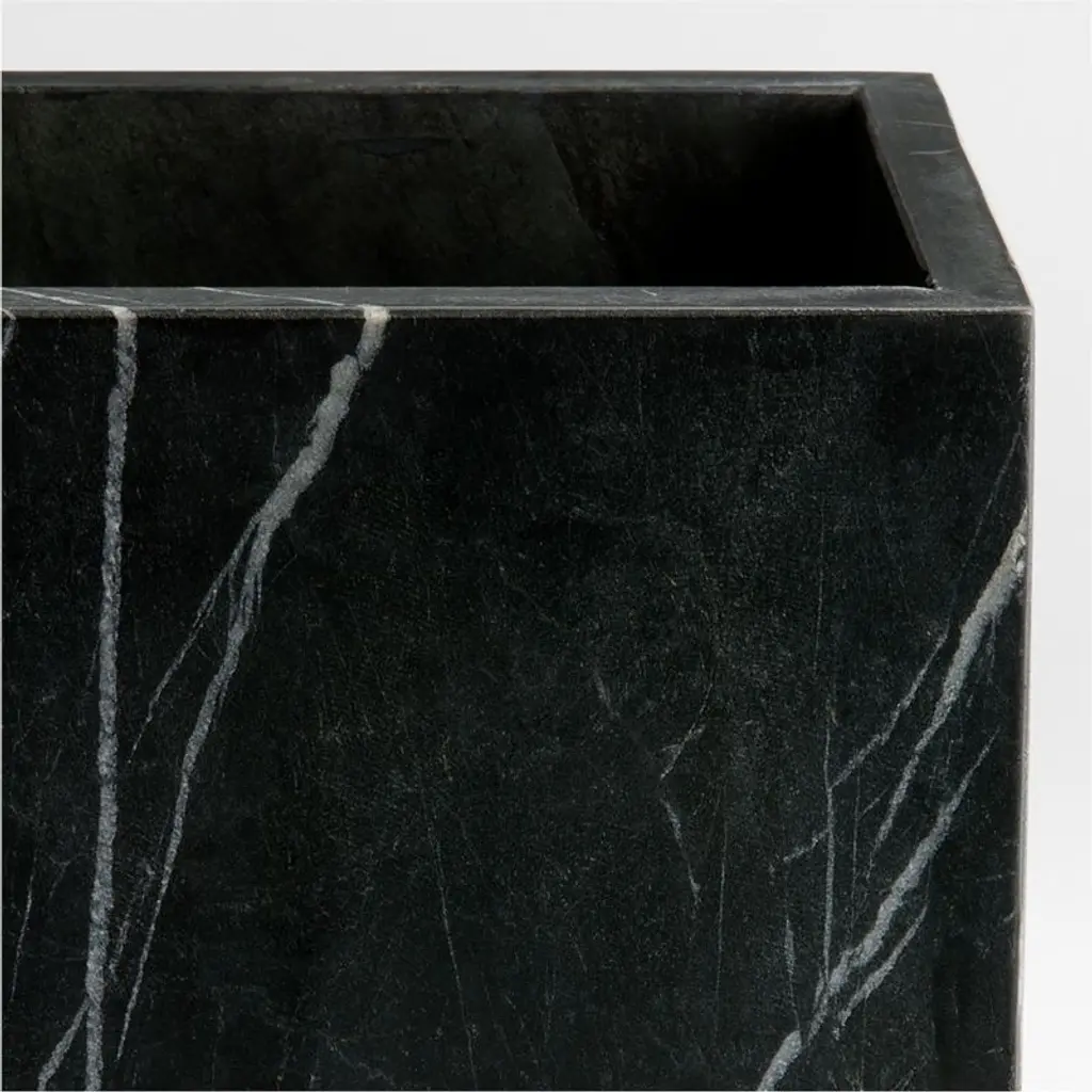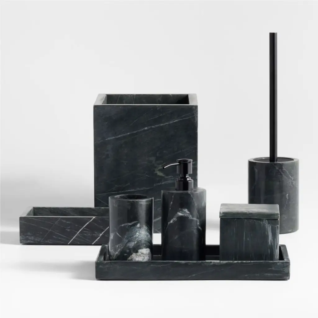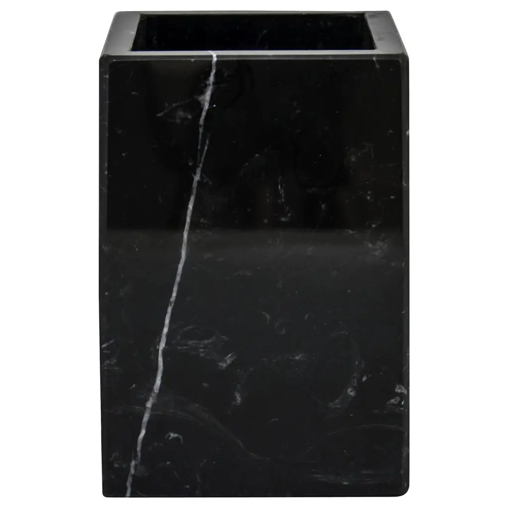 Our Bleecker collection brings the dramatic beauty of black marble to your powder room, guest bath or en suite. Sleek, modern lines keep all the focus on the stone's intriguing grey and white streaks. Cut with crisp corners, this waste basket has a strong presence. Add our other gorgeous-yet-practical Bleecker accessories for a unified bathroom that's ready for hosting. Due to the natural marble, each trash can is fascinatingly unique.