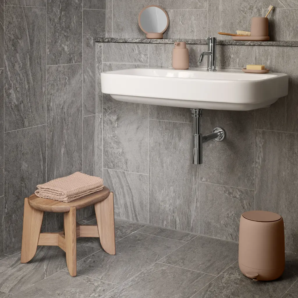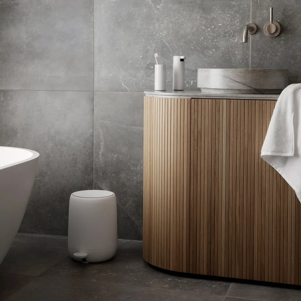 Selecting the right wastebasket can completely transform the ambiance of your bathroom. One such example is the Sono Pedal Bin Wastebasket from Blomus’ Sono collection, showcasing an exquisite design. Its graceful curved shape and textured finish elevate the aesthetic of any interior. The bin’s velvety-smooth surface is crafted from premium silicone, which not only feels delightful to the touch but is also simple to keep clean and spotless. With the help of the recessed lid, triggered by a gentle press of the pedal, the opening and closing operate smoothly and quietly. Furthermore, the detachable plastic basket inside enables effortless cleaning. This stunning pedal bin is available in various captivating neutral colors, complementing the other products in the Sono collection.