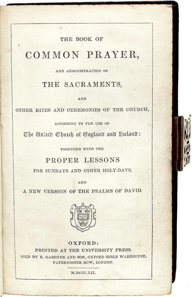 AUTHOR: (BOOK OF COMMON PRAYER). TITLE: The Book of Common Prayer, and Administration of The Sacraments, and Other Rites & Ceremonies of The Church,....PUBLISHER: Oxford: The University Press, 1852.DESCRIPTION: 1 vol., 5-13/16" x 4". Bound in full elaborately blind tooled brown morocco, raised bands, gilt title to spine, chased brass clasp, all edges gilt ad goffered, marbled pastedowns and endpapers.CONDITION: Internally clean and bright, foot of spine fine, small chip to head cap of spine, hinges fine, a VERY GOOD copy.