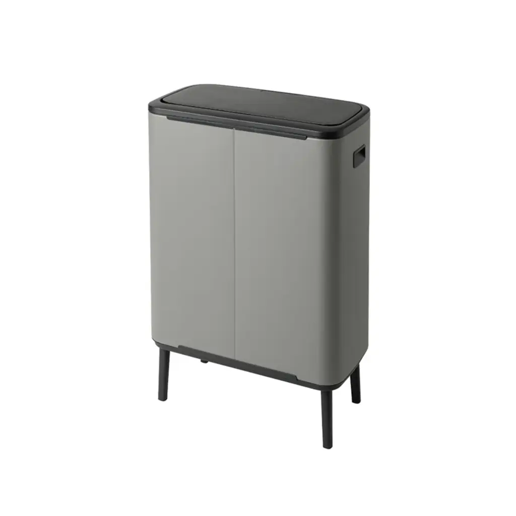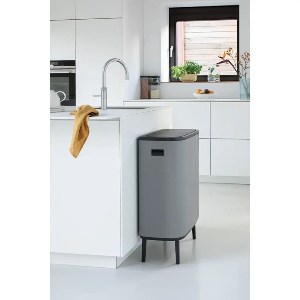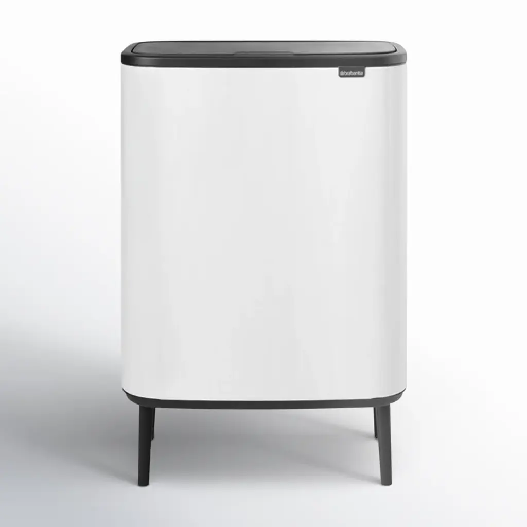 Looking for a beautiful solution for waste separation? This XXL Brabantia Bo Hi-Touch Top Trash Can (2 x 8 Gallon) has a beautiful design plus all you need for easy waste separation at home. Like two spacious and removable inner buckets for 2 kinds of waste. It opens at the lightest touch, fits perfectly against a wall, and is very stable thanks to the adjustable non-skid legs. Double value on a single spot.