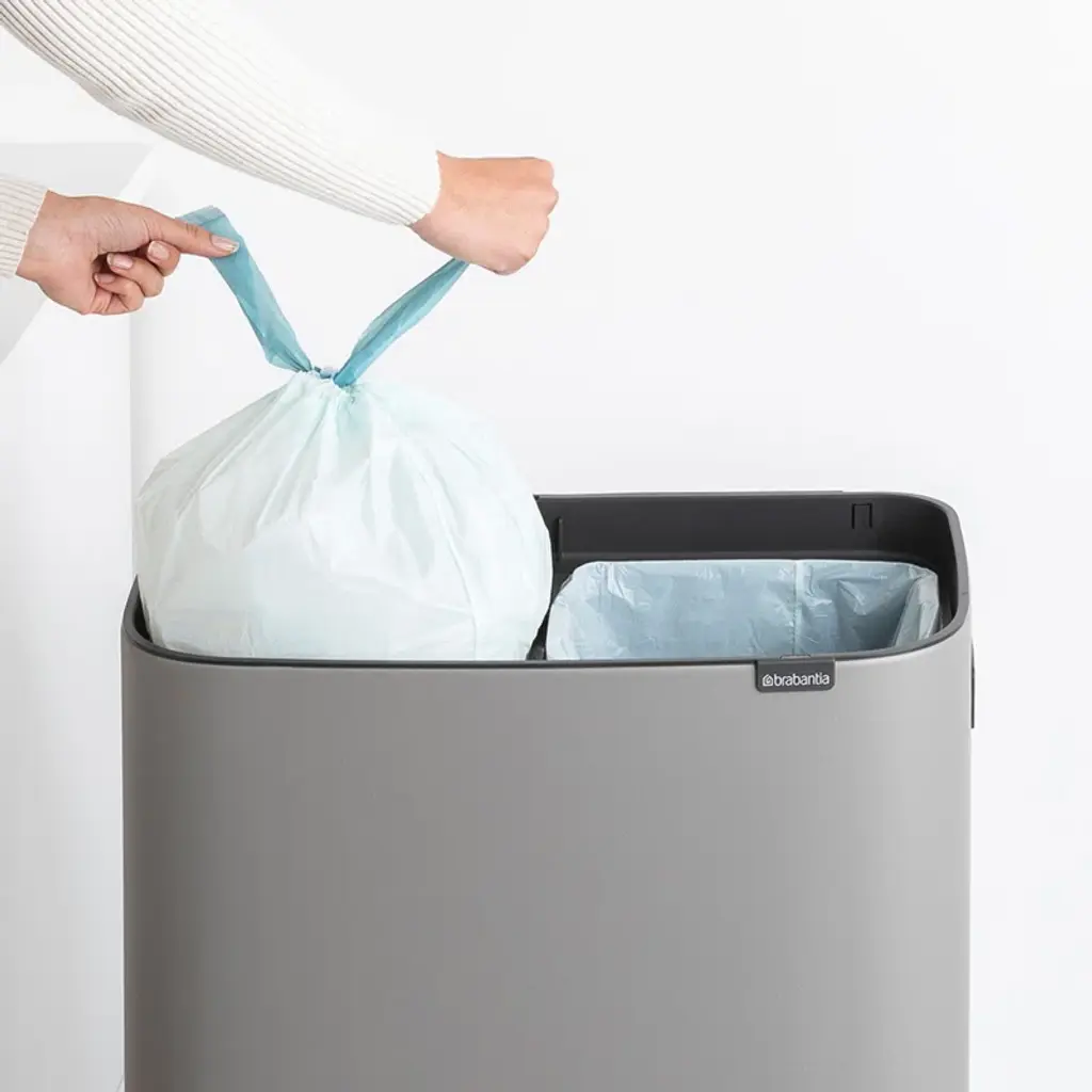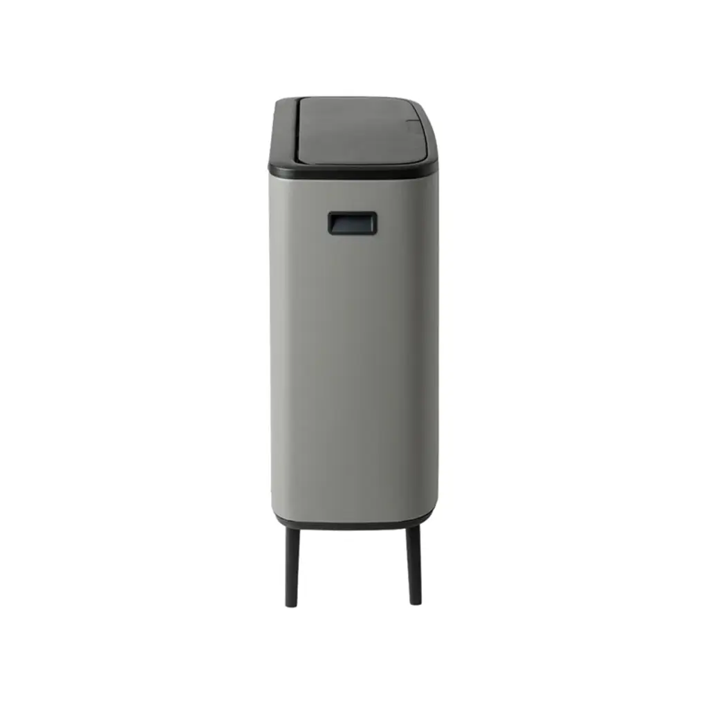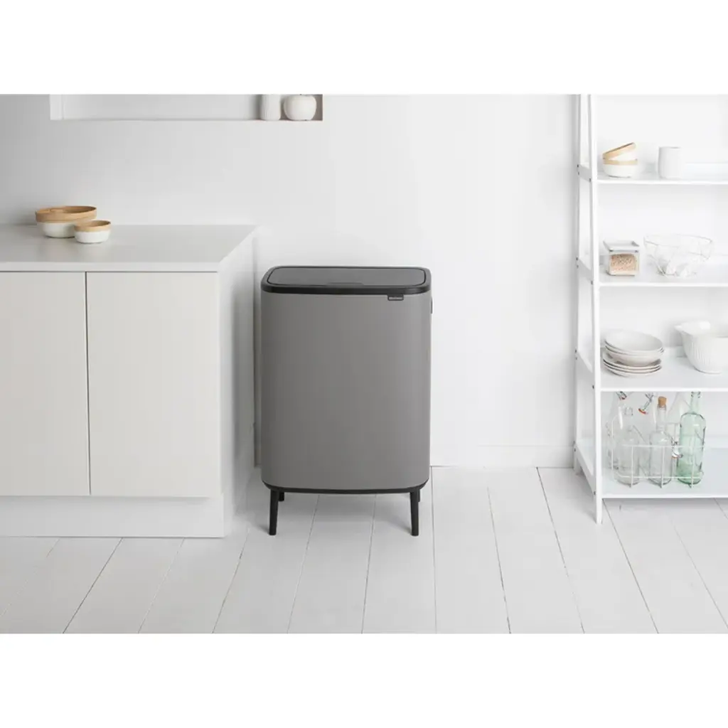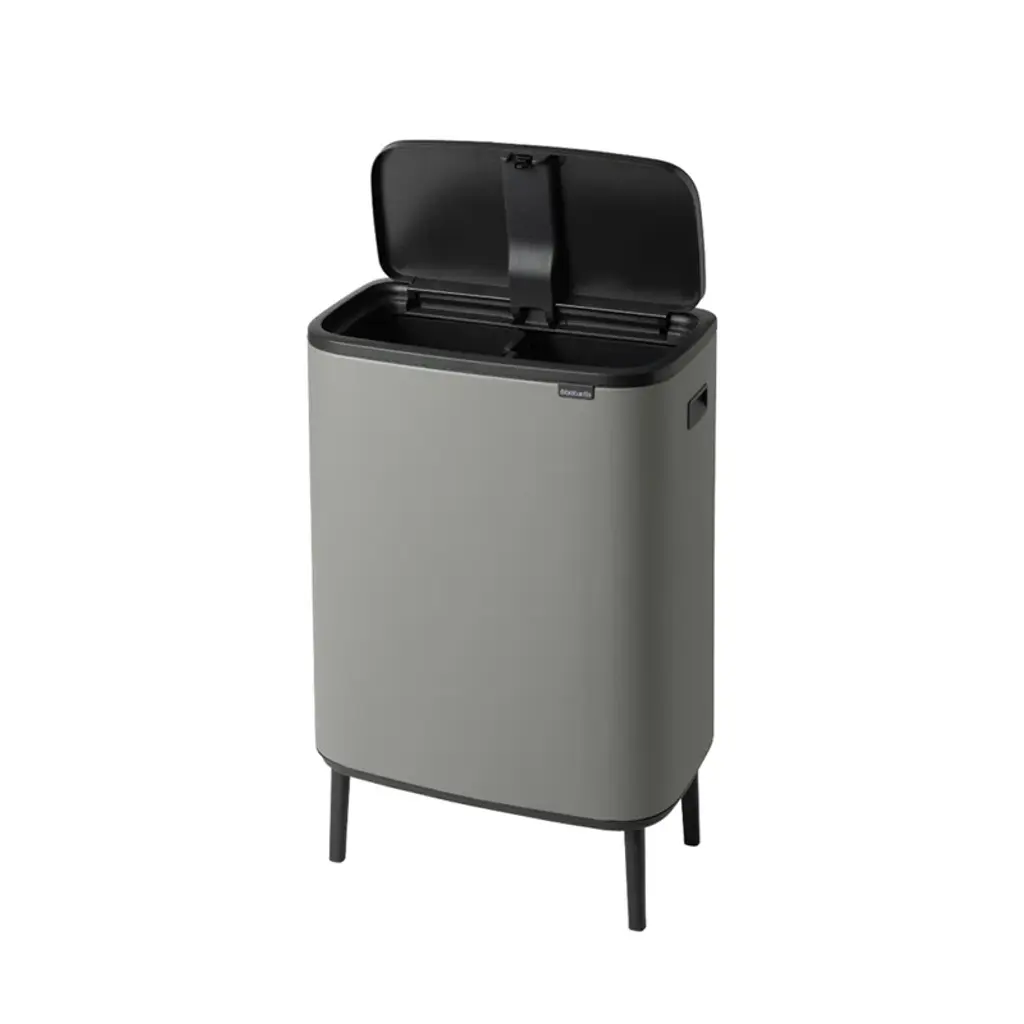 Looking for a beautiful solution for waste separation? This XXL Brabantia Bo Hi-Touch Top Trash Can (2 x 8 Gallon) has a beautiful design plus all you need for easy waste separation at home. Like two spacious and removable inner buckets for 2 kinds of waste. It opens at the lightest touch, fits perfectly against a wall, and is very stable thanks to the adjustable non-skid legs. Double value on a single spot.