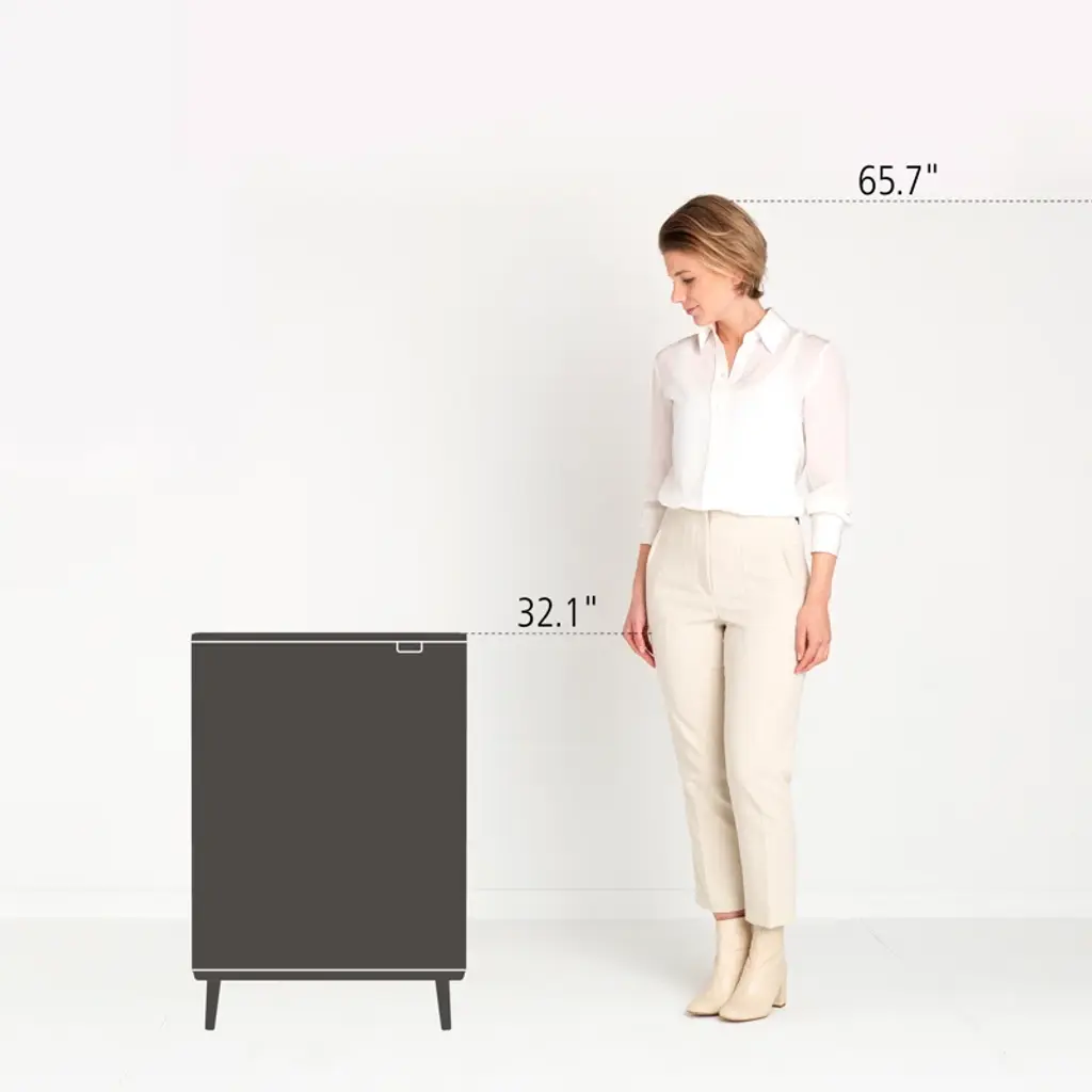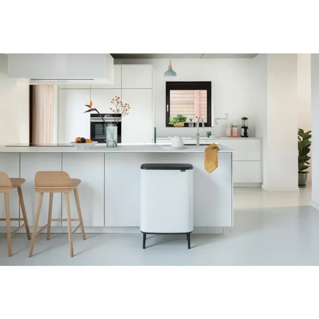 Looking for a beautiful solution for waste separation? This XXL Brabantia Bo Hi-Touch Top Trash Can (2 x 8 Gallon) has a beautiful design plus all you need for easy waste separation at home. Like two spacious and removable inner buckets for 2 kinds of waste. It opens at the lightest touch, fits perfectly against a wall, and is very stable thanks to the adjustable non-skid legs. Double value on a single spot.