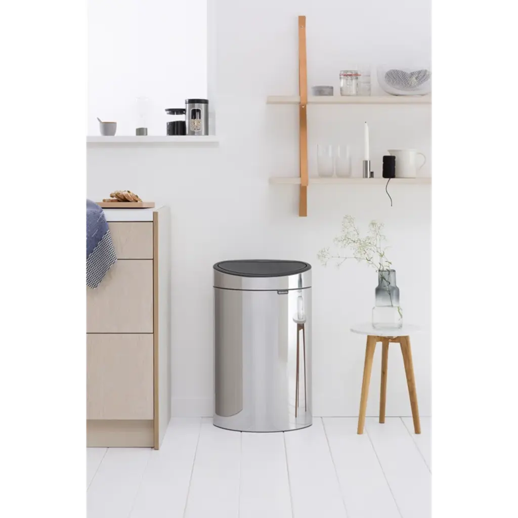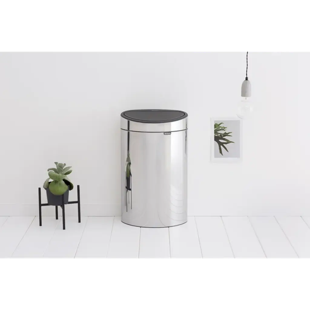 Add a touch of design to your home with the Brabantia Touch Bin, 10.6 gallons (40 liters). great, yet space-efficient, organizing help that looks the part too. Just touch the lid, and it opens smoothly. It also has a timeless design, is easy to clean, and protects your floor thanks to the protective rim. This touch bin is ready for years of intensive, problem-free use!