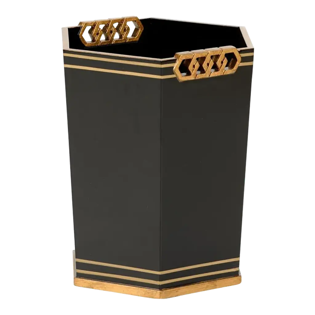 Black Lacquered Iron Wastebasket With Antique Gold Details. Features Stunning Antique Gold Fretwork Trim. Collect Trash In Your Home Or Office In This Classic Receptacle Designed To Blend With Any Decor.