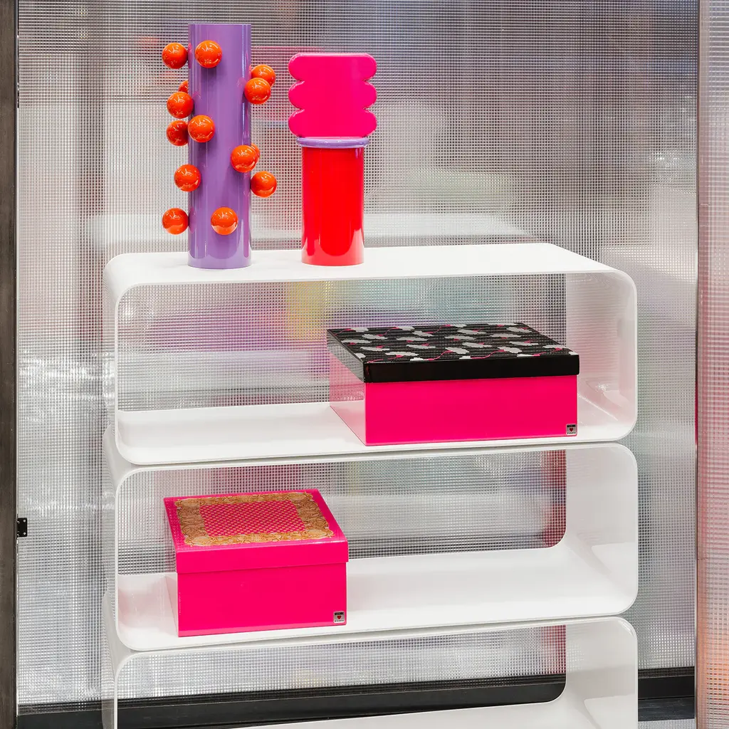 A striking array of simple colors and forms, this refined bin is a testament to innovative design and traditional artistry. Part of the Paris in the Twenties Collection dedicated to the places frequented by Ernst Hemingway, this bin is an homage to Cafè des Amateurs (today La Chope) where Hemingway frequently got drunk from lively conversation and company. The tall cylindrical bin in vivid red is paired with purple lid accented with a distinctive curved topper. Made entirely of aluminum, this timeless piece will enliven any living room, bedroom, vanity, or private study decor.