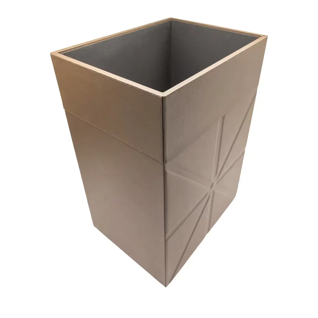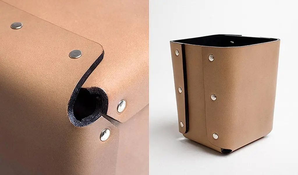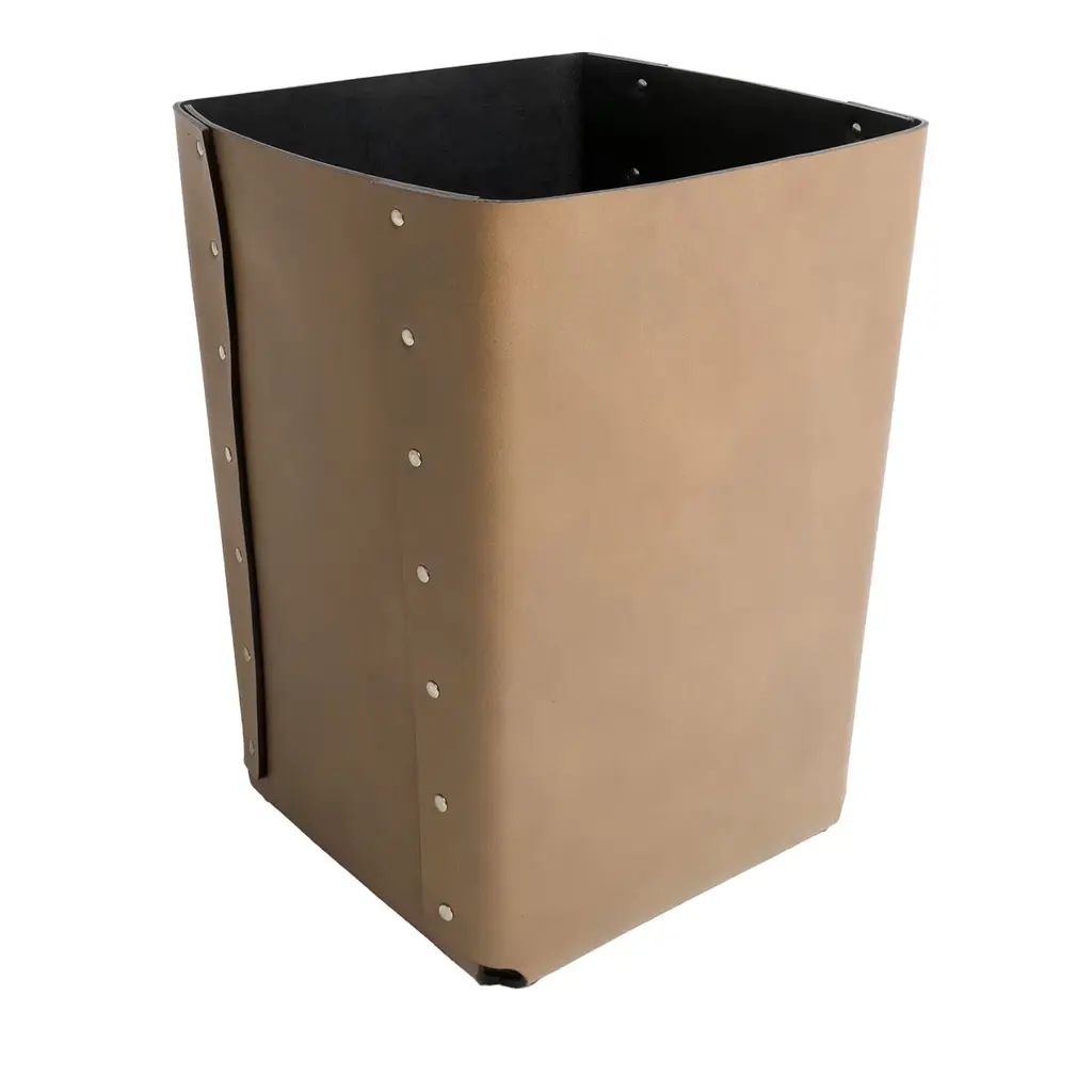 "Carlo" is a riveted leather wastepaper bin, designed by Claude Bouchard and manufactured by Oscar Maschera. Genuine Italian leather vegetable tanned. Colors combination to be chosen from the available range: tan, sienna, orange, red, red-purple, dark brown, khaki, blue, black.DIMENSIONS:D. 10.2", W. 10.2", H. 13.3"The leather is doubled to obtain greater thickness and a color contrast between inner and outer surfaces; it's then folded and held together by metal rivets: the object has taken shape. Leather, robust and soft, which maturates over time like wood, wine, brandy and cheese, is a material suitable for a living relationship with people and things it has to do with: it absorbs their scent and gives its own. It protects, gathers and changes shape, as it retains something of the life it once had.Past experiences in working with leather, with objects of common use transformed into their own form by the material of which they were made (baskets, boxes, trays, writing-desk items, small pieces of furniture, in addition to bags and cases, of course) have led Oscar Maschera to today’s production which has exceeded even the limits of explicit reality to get the pure form of the objects, reaching beyond the risky limit of mere functionality.CLAUDE BOUCHARD, interior architect and designer by training, is well known for his pieces of design in ceramics, porcelain, glass, metal and wood for firms such as Hermès, Puiforcat, Porcelaines Bernardaud, Faïenceries de Gien and the Musée des Arts décoratifs de Paris in France, Triangolo in Italy, Anthologie Quartett in Germany and Vista Alegre in Portugal.He has been artistic director of Puiforcat, the silversmith subsidiary of the Hermès group (2007 – 2009). Claude Bouchard’s work is focused on the physical, emotional and esthetic relationship between the object or space created and people who use or experience it. He has always questioned the simplicistic principle of “purity” and “functionalism”.During all his work Bouchard has been trying to bring a profoundly contemporary form of expression to traditional techniques and materials and thus to help the conservation and renewal of those endangered techniques. Claude Bouchard lectures both for the architecture Department of Columbia University and at the Camondo School of design and interior architecture.Claude Bouchard’s work has been shown at the Galleria Blanchaert in Milan, at the Biennale di Faenza, at Max Alto and the Square de Vergennes Gallery in Paris, at the Biennale de St. Etienne, and at the craft in several retrospective exhibits in France, Belgium and Japan and several of his works are now in museum collections (Musée des Arts décoratifs Paris, Musée des Arts décoratifs et des Textiles de Lyon, etc).