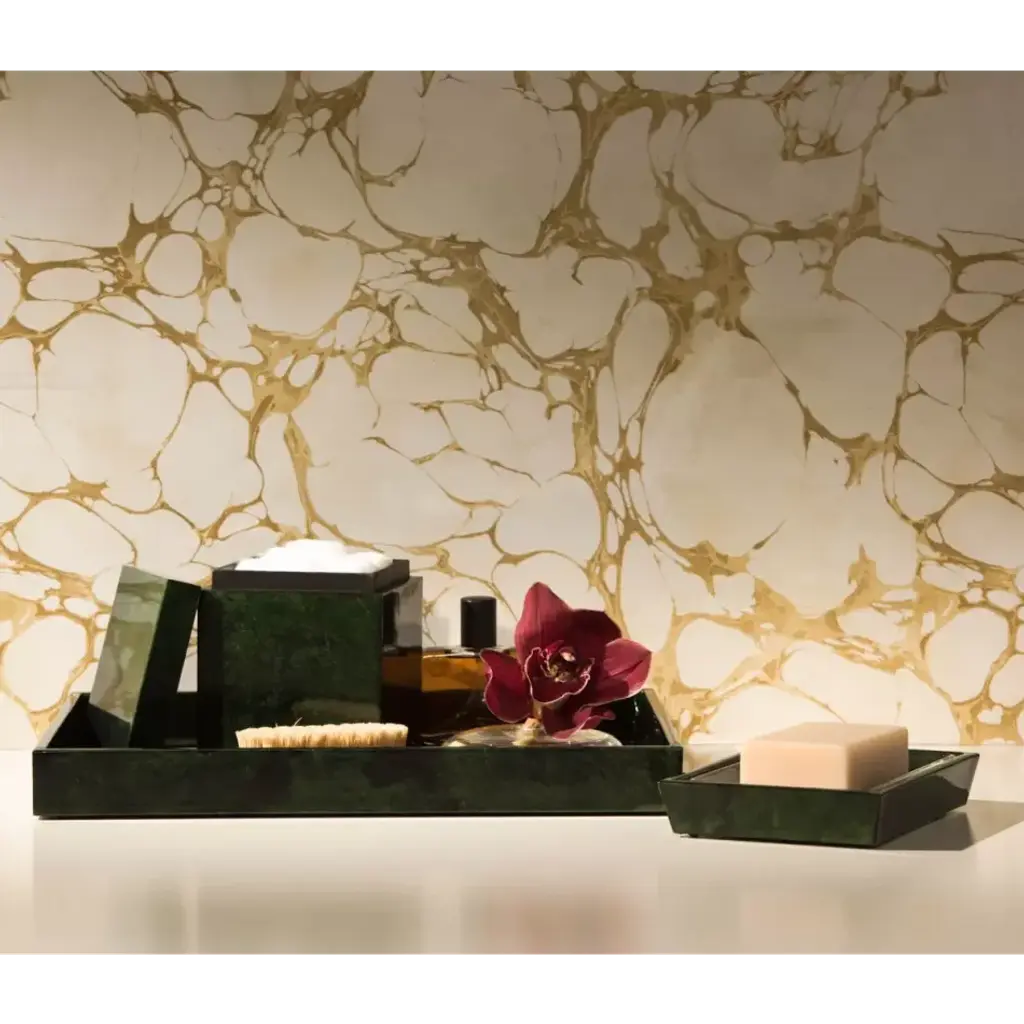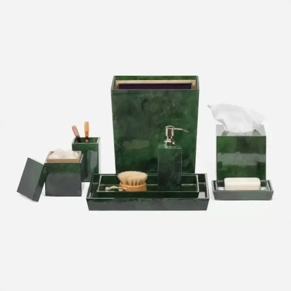 Faux vellum leather bath collection with shiny lacquer. The designers at Pigeon & Poodle believe the details of a home are just as important as the furniture. A gorgeous toothbrush holder or handcrafted canister can elevate an entire bath, the perfect frame can heighten the feel of a whole space, and a good-looking storage basket can be your look’s missing link. With thoughtful design and top-notch craftsmanship, Pigeon & Poodle create home accessories with the care and attention typically reserved for larger pieces of décor.