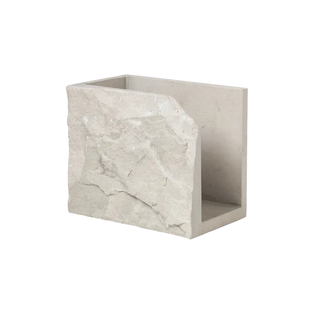 With its monolithic, purely geometric volumes, this collection for the office is characterized by graphic details born from the juxtaposition of two nuances of travertine, which creates a distinctive visual contrast with the material and porous aspect of such marble. Design by Simone Fanciullacci.