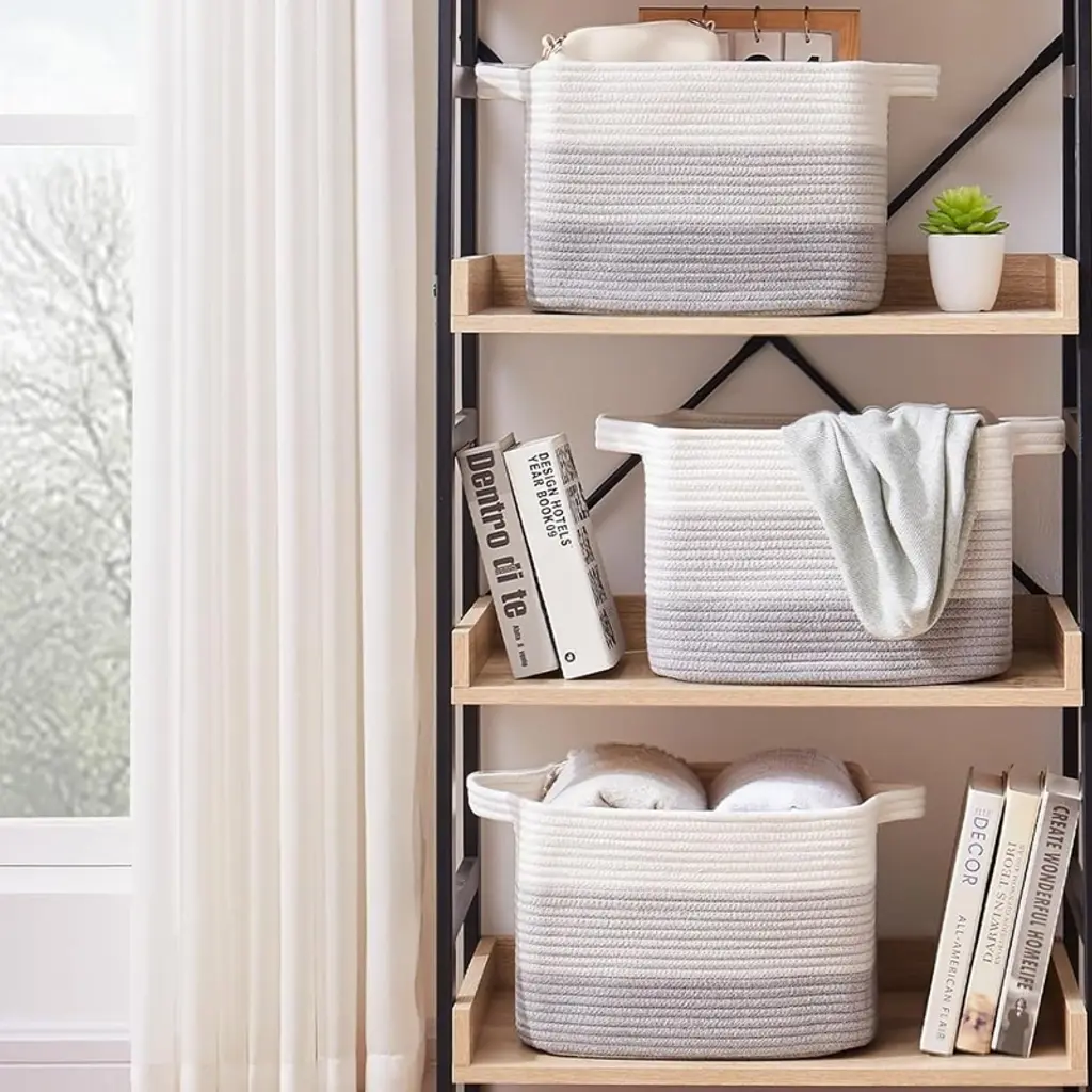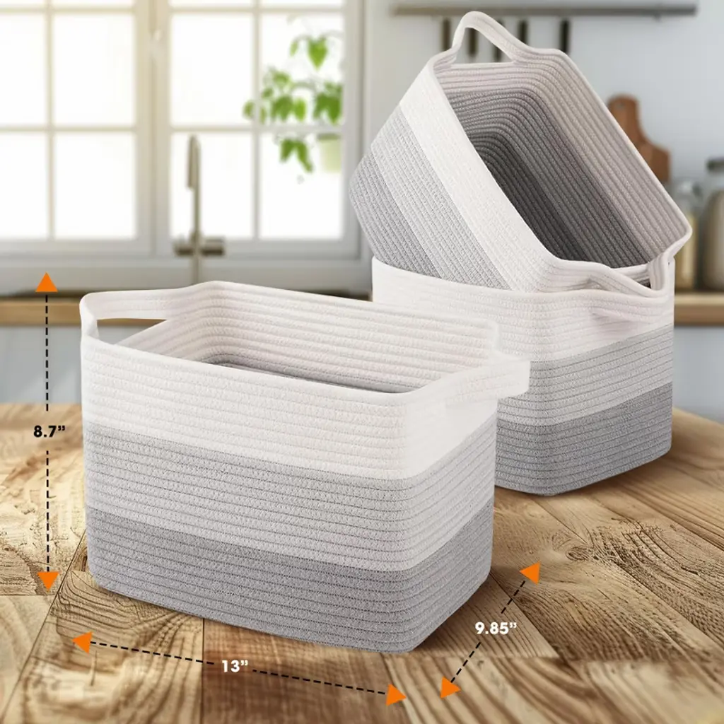 Organize your home with the Cheer Collection Set of 3 Cotton Rope Storage Baskets, each measuring 13 inches wide by 9.85 inches deep and 8.7 inches high. These handcrafted baskets come in three stylish color options—3 Tone Black, 3 Tone Gray, and 3 Tone Tan—making them perfect for any room décor. Made from 100% natural cotton rope, they’re soft, skin-safe, and chemical-free, making them ideal for nurseries, bathrooms, and living areas. The sturdy design and reinforced stitching ensure they hold their shape, while the foldable construction allows for easy storage when not in use. Use them for organizing towels, laundry, toys, blankets, books, or shoes—all with a touch of style and practicality