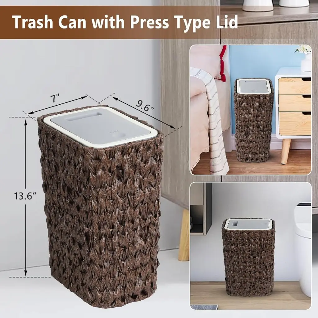 Introducing the Slim Space-Saving Trash Can – a multi-functional, odor-controlling bin designed for tight spaces like bathrooms, bedrooms, or kitchens. With a compact 9.6"×7"×13.6" size, this 2.6-gallon trash can features a dog-proof pop-up lid, wicker-style design, and convertible functionality (use as a wastebasket or laundry hamper). Its smooth, easy-clean surfaces and odor-trapping lid keep your space fresh and tidy.