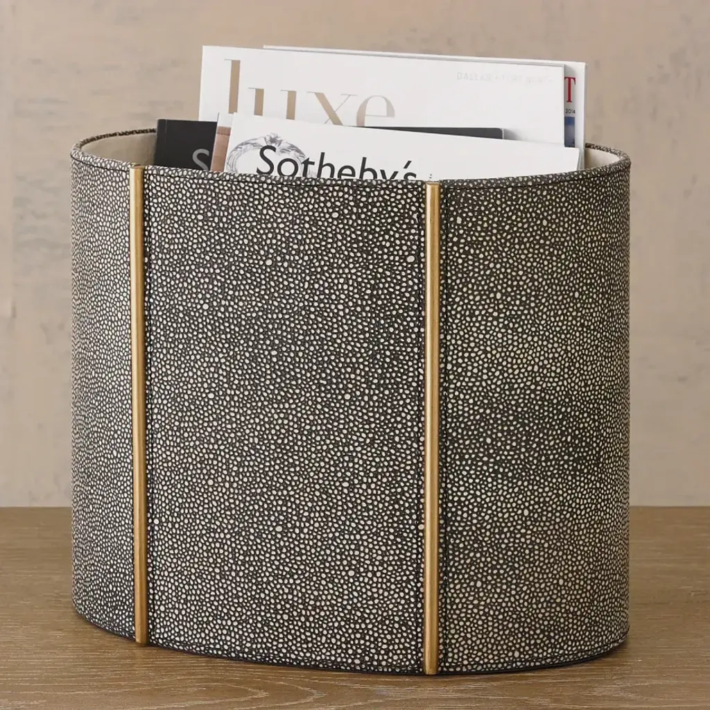 Faux Shagreen Leather Wastebasket with perfectly placed vertical gold-painted wood trim. From a fashion forward perspective, Global Views offers accessories, furniture, statement lighting, and an assortment of rugs and mirrors to add beauty and joy to your home.