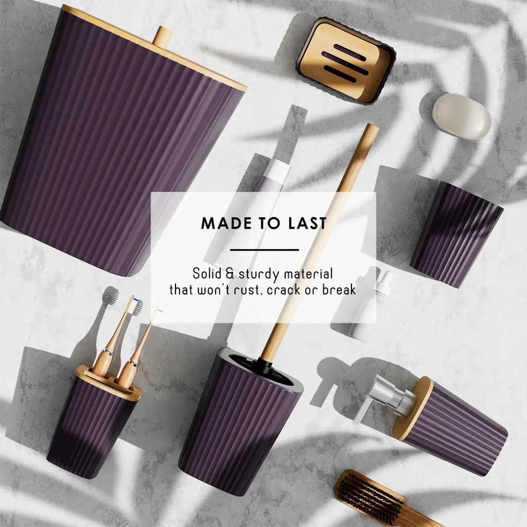 Clara Clark Bamboo Bathroom Accessories Set With Shower Curtain Set, Toilet Brush, Trash Can & Soap Dispenser - Complete Set + Bath Rugs - Purple