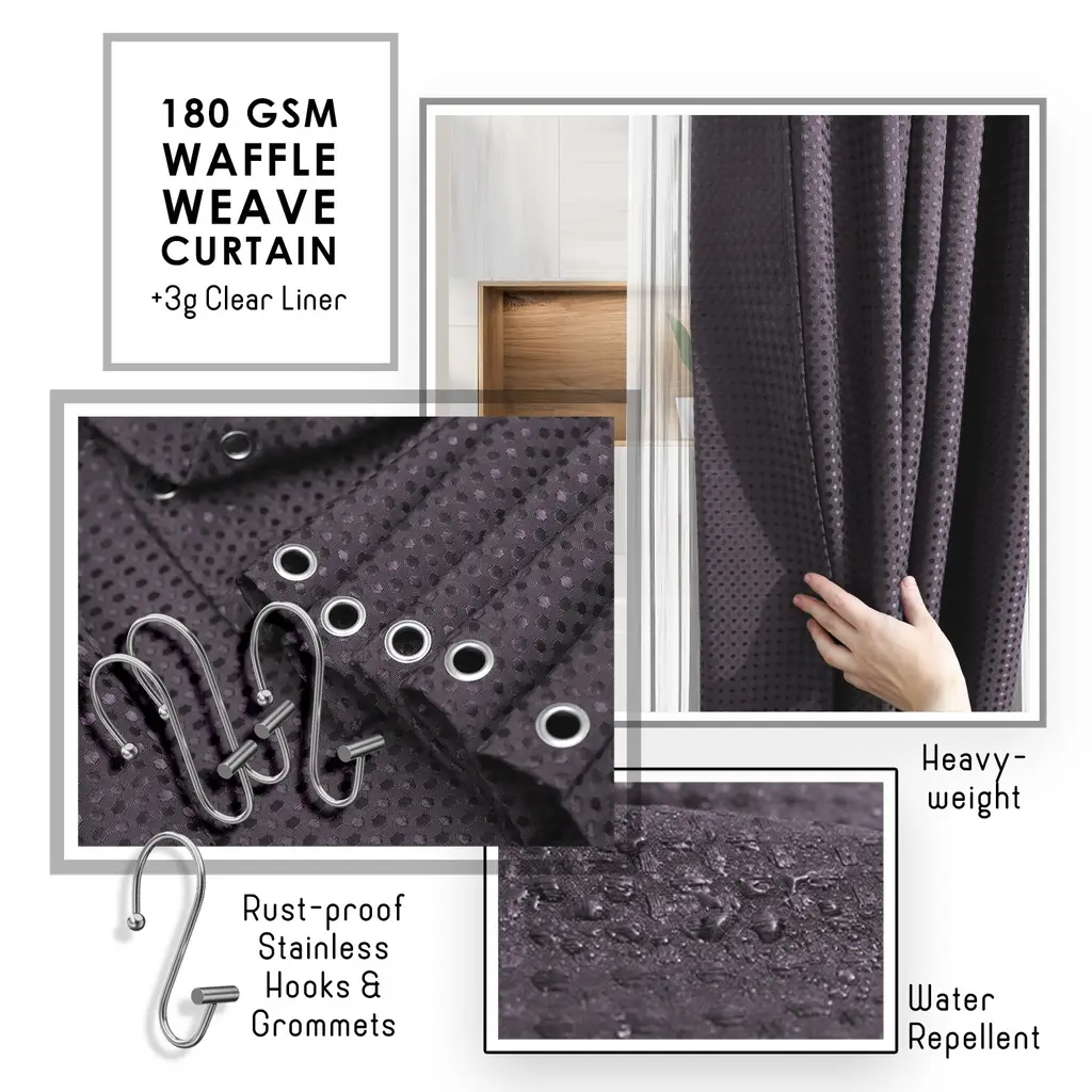 Transform your bathroom into a sophisticated oasis with our complete bathroom accessories set, featuring natural bamboo accents. The set includes a waffle-textured shower curtain set with a clear shower curtain liner and 12 shower curtain hooks, a variety of essential bathroom items, and the additional option of 2 non-slip, plush, chenille bath rugs. Designed for both style and organization, our elegant bathroom accessories turn your bathroom into a spa-like retreat, making each moment a luxurious experience.Features: Inclusions & Dimensions: